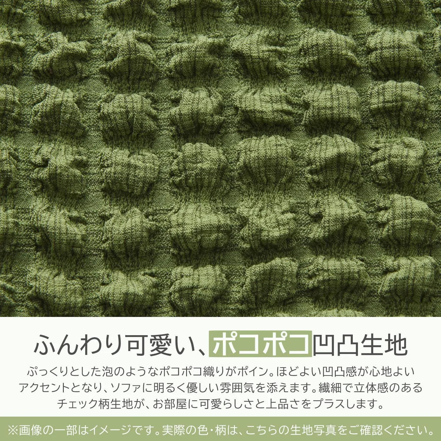 【ポコポコ凹凸生地】ぷっくりとした泡のような凹凸感が特徴のポコポコ織り。ふんわりと柔らかく、触れるたびにやさしい心地よさを実感できます。可愛らしい見た目と明るい雰囲気で、お部屋を柔らかく彩ります。ソファにかけるだけで一気に華やかさをプラスし、ほんの少し特別感のある空間を演出。日常をより楽しく快適にしてくれる素材です。