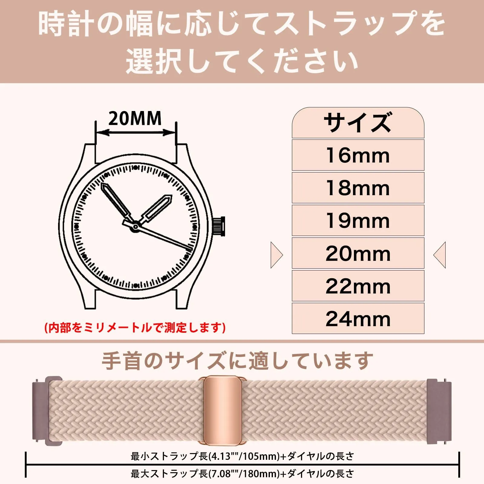 【20mm 対応機種】20mm/22mm 全機種に対応サイズがあります。フィットサイズ:フィット6.3-9.5 (160mm - 240mm) 手首。長さは無段階で自由に調整可能で、どんな手首でもフィットできます。購入する前に、お手首の周りを測定してください。