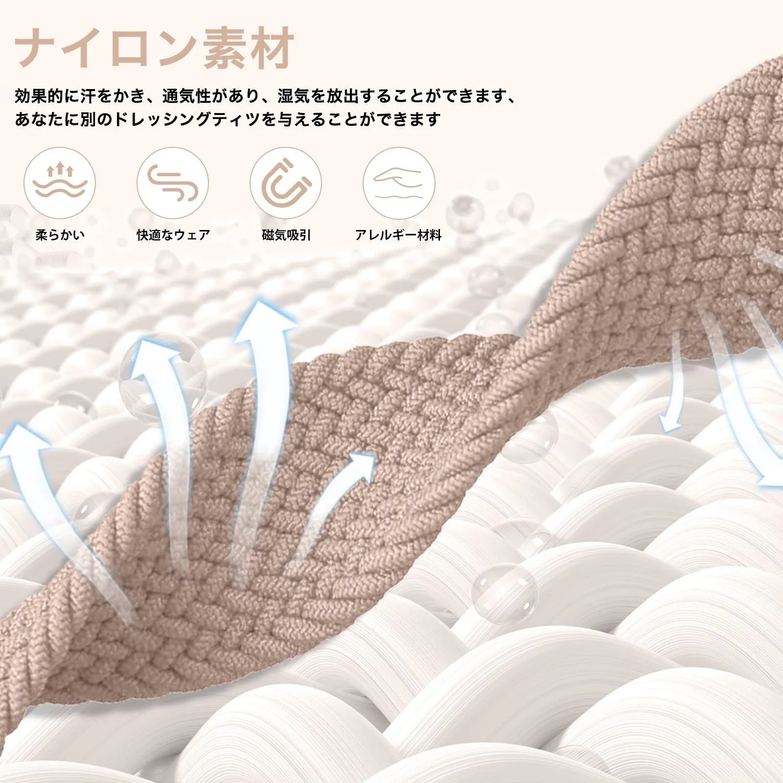 【ソフトのナイロン素材】この編み込み バンドは、伸縮性である高品質ナイロン素材で作られています。軽量で柔らかいし、滑らかなバンド編み面は肌に快適な感触を与えて、肌にもやさしいし、通気性も抜群で、快適な着け心地を感じられます。変形にくい素材なので、汚してしまった場合でも丸洗いこともできて、便利です。