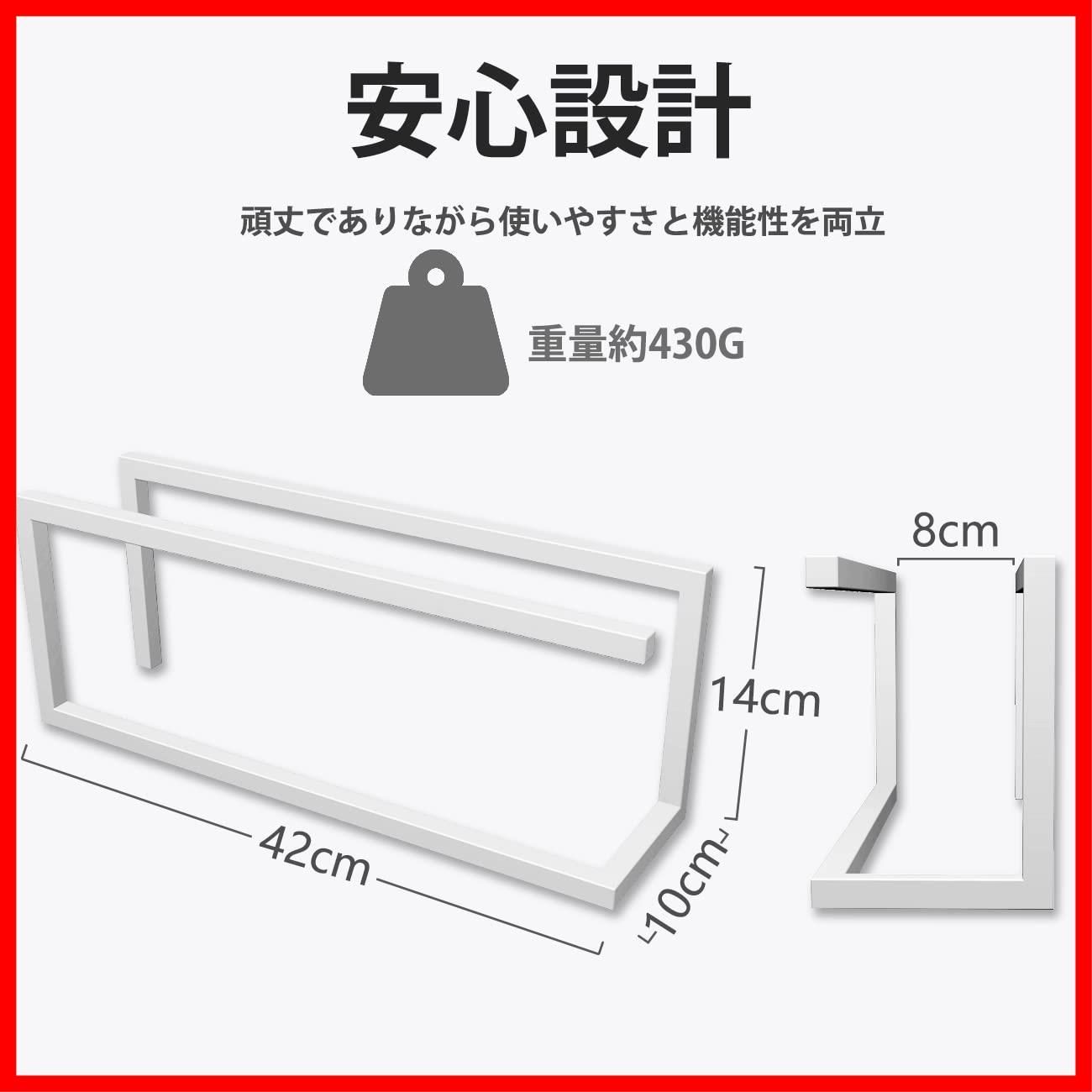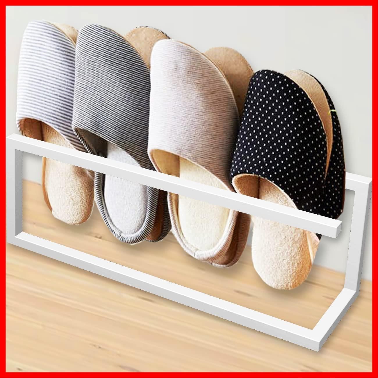 【スリッパラック】サイズ:約42 * 10 * 14cm。重量:430g。素材:鉄。シンプルなスリッパラックです。スリッパを4足まで収納できます。角型の形状であり、壁や部屋の四隅にぴったりと収められます。薄型なので、リビング、浴室などに省スペースで設置できます。スリッパだけでなく、スニーカーの収納にもおすすめです。
