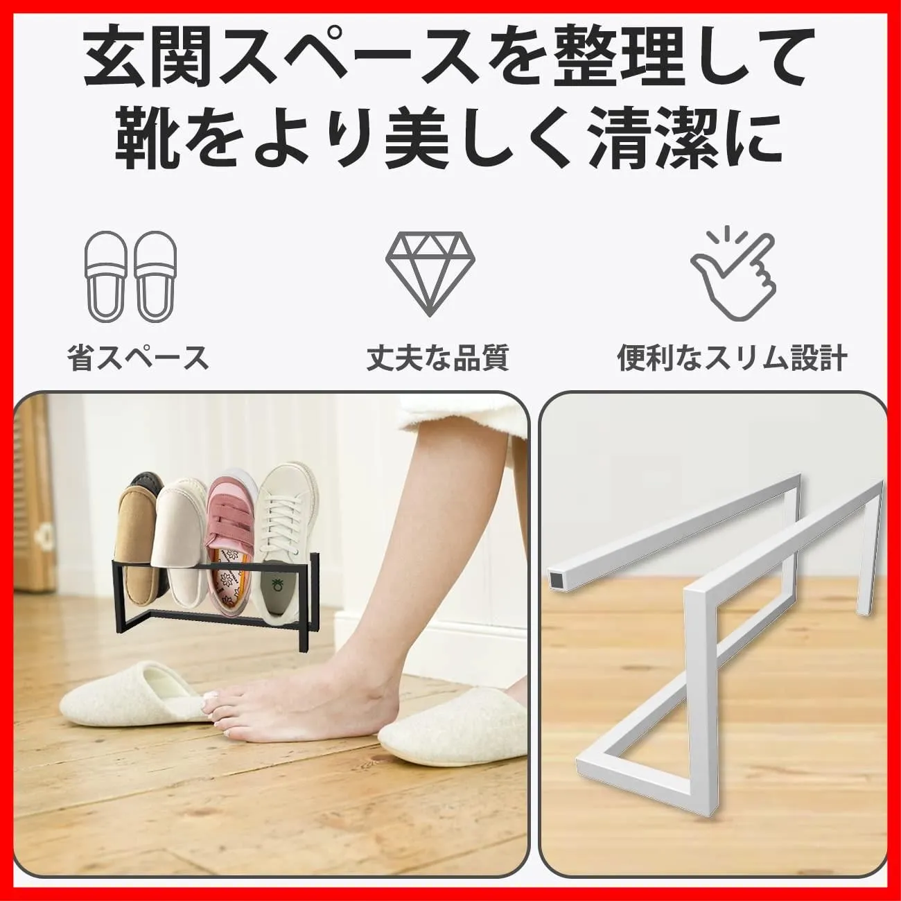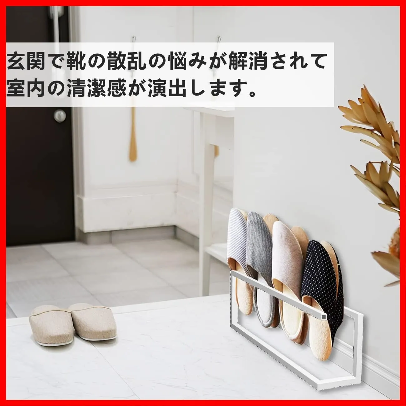 【省スペース設置】スリッパラックの玄関収納を有効活用すれば、忙しい朝や来客時もつまずいたり探したりすることなく、快適にお過ごしいただけます。スリッパの収納法は、部屋に入った時の好感度を左右します。清潔感のあるおしゃれなスリッパラックを使いましょう!北欧風だけでなく、洋風・和風問わずあわせやすい。