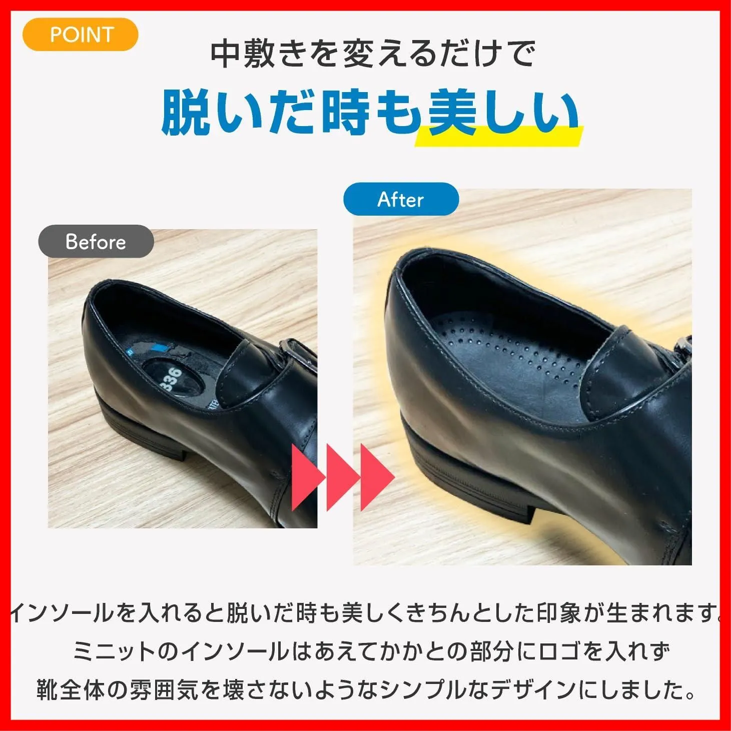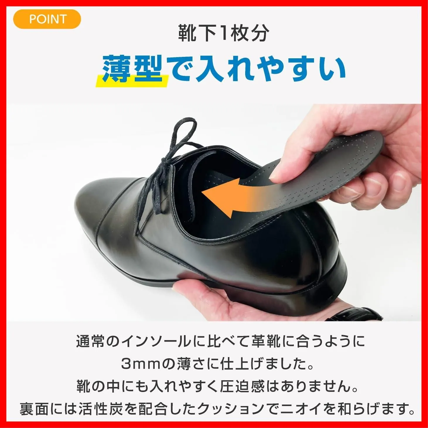 【シープレザーの上質な肌触り】キメ細かいシープレザーを使用したレザーインソールです。なめらかな肌触りで革靴の中敷きとして違和感が出にくく、ビジネスシューズやドレスシューズにも合わせやすい設計です。薄型で入れやすく、日常の革靴ケアを整えます。