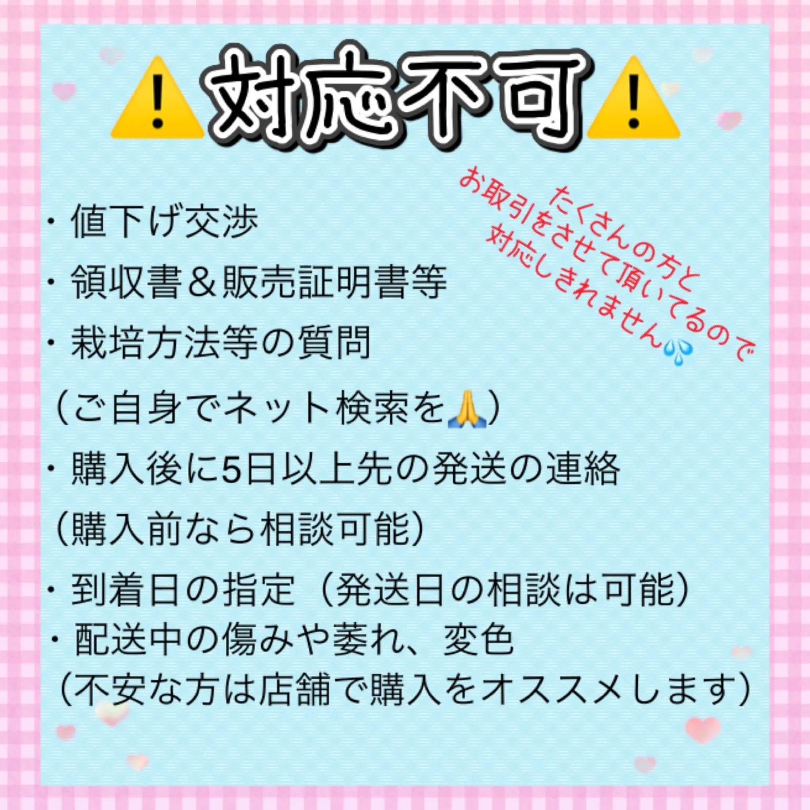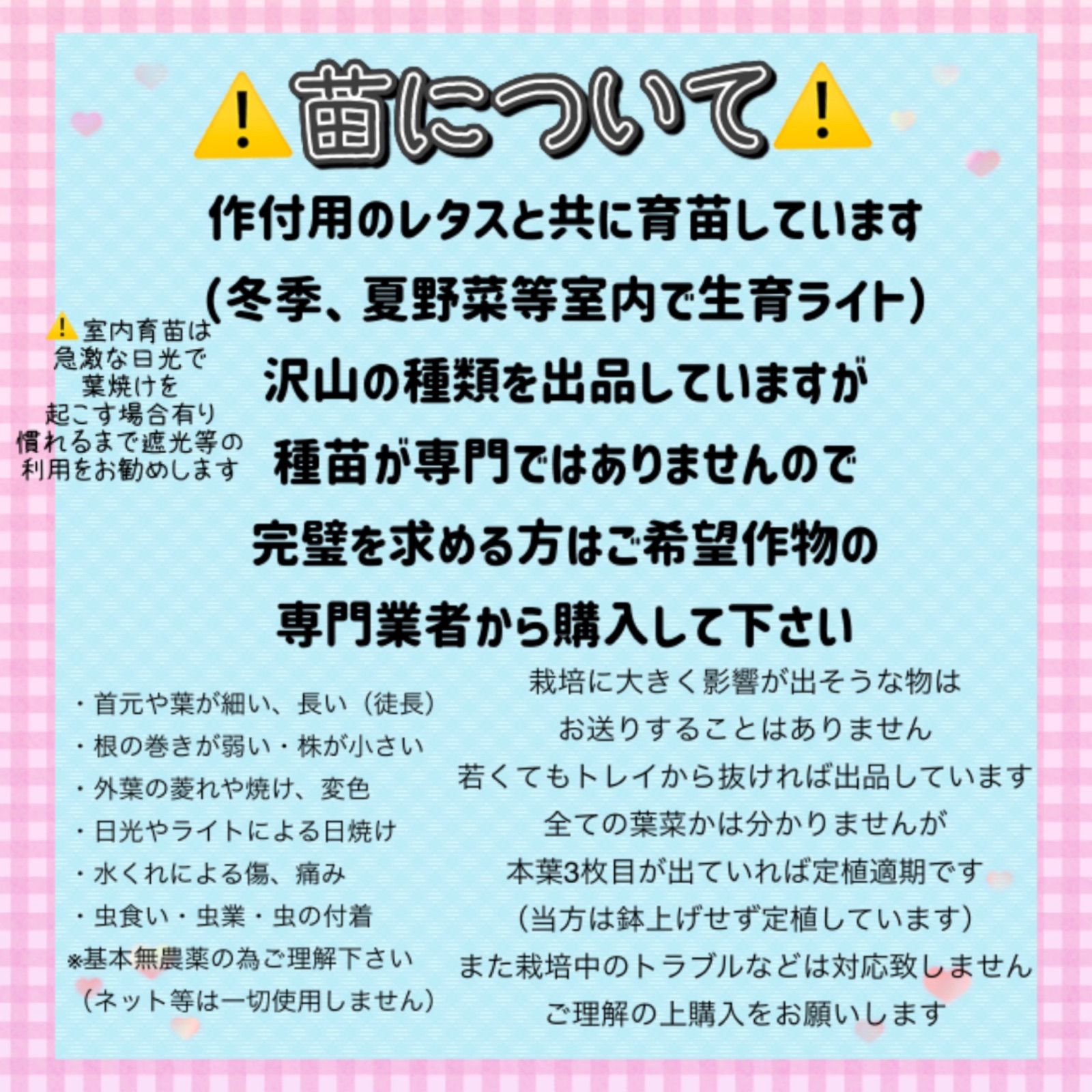 ⚠️プロフィール、商品説明⚠️お読み下さい 専用出品は対応不可ですので、 設定されている組み合わせからお選びください。 ▷基本育苗中農薬不使用ですが 苗の状態によっては薬を使ってる場合有り ▷200穴育苗(1穴数粒播種) ▷小さな苗床にて育苗 細めの小ぶり苗ですが 畑に植え付ければしっかり育ちます (肥料等など適切に施している場合) ▷在庫状況によって 播種日が違うものでお作りすることがあります。 苗の太さやサイズに違いがありましても、 ご理解下さいますようお願い致します。 ⚠️第4種郵便→郵便ポスト投函(長形3号封筒) ∇出荷曜日∇ (発送元➜群馬県北部) 近県▷月火水 その他&離島▷月火 土日祝が配送お休みになります 祝日の有無により10日以上の場合も有り得ます 遠方ですと運送に4日~5日程度かかります 金曜に不着の場合▷週明け配達 保証や再送等は出来ません ご理解の上で購入をお願いいたします 離島等であっても強制は致しません ご自身の判断でお願いします ⚠️販売の為だけに育苗している作物も多数あります 栽培に関しての質問はお答え致しません 栽培時期などは 地域や環境でご自身で判断でご購入お願い致します ⚠️急な品切れや状態悪化などで キャンセルまたは育苗日数を頂く事が有ります 取引ページにご連絡することがあるので 連絡は取れるようにして下さい ⚠️配達による状態の変化について 発送による傷や萎れ、変色や痛み 葉落ち等が発生する事があります 状態がいい物でも日照不足や 蒸れ等により状態の変化は起こります 運送中のトラック内は高温になりますので 状態に変化が起こりやすくなります。 春夏秋は特にご理解の上 ご購入下さいますようお願い致します。 ⚠️ 植物は日々動く為早めに出品しています 土崩れ、根詰まり、外葉の老化等ご理解ください 在庫次第で播種日も変動します ⚠️苗の色、根の巻き、サイズ等に違いがあります イメージ写真と御理解ください #ネギ類一覧