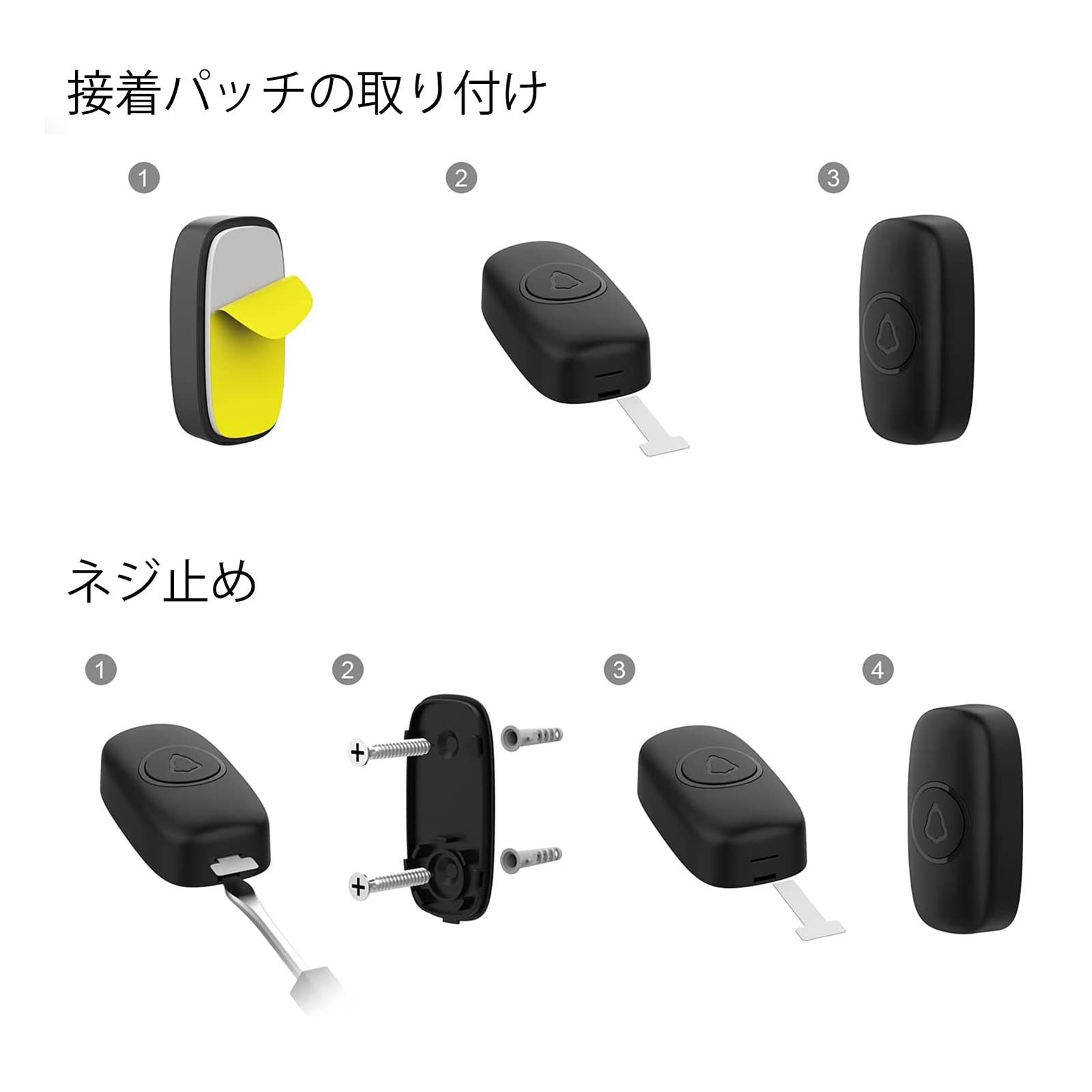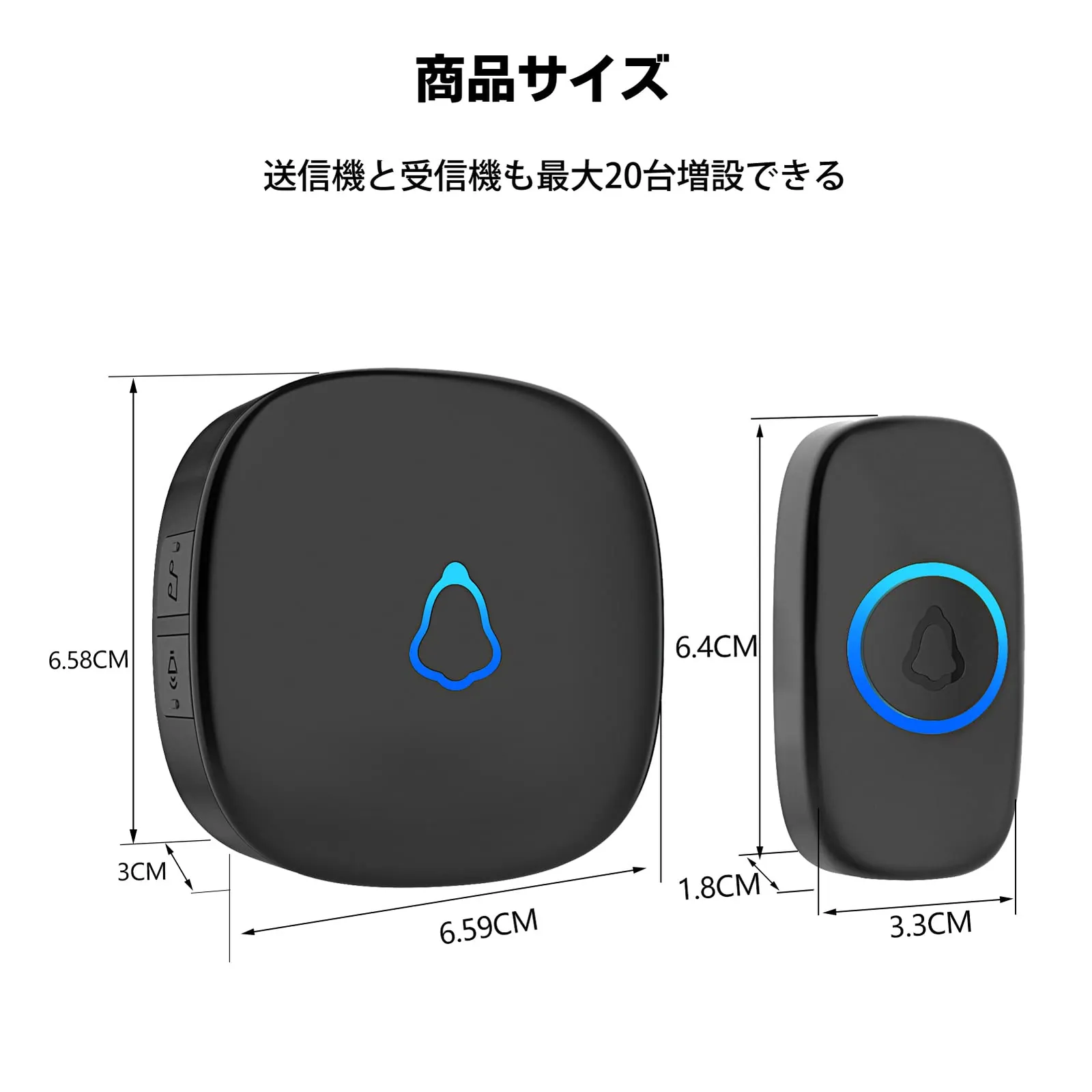 【耐候性 & 省エネルギー】ドアベルは高品質のABS素材製で、耐火性と難燃性に優れています。動作温度:-20?60°C(4?140 °F)。IP55の防塵・防水性能。受信機には最適化した回路設計を採用。送信機はボタンを押さない限り電力を消費しません。電池寿命:3年間。