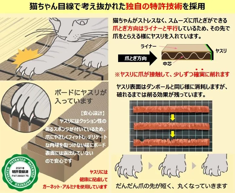 【ご購入にあたって】 ★ 爪とぎには「癖」があるため、爪全体が均一に削れない場合や、狼爪(ろうそう:人の親指にあたります)は内側に丸く曲がっているため、削れにくい場合があります。 ★ 猫ちゃん1匹に1個を推奨しておりますので、共用する場合は爪が削れる効果が出る前にボードが消耗してしまう可能性があります。 ★ 若くて大型の猫ちゃんは爪とぎの力が強過ぎて、爪が削れる効果が出る前にヤスリが破断してしまうことがあります。 ★ ヤスリ部の色は予告なく変更する場合がありますのでご了承ください。