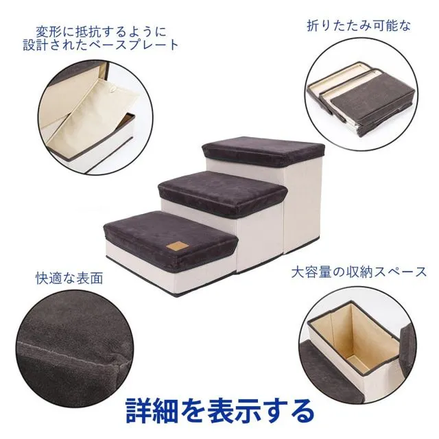 商品の説明商品説明小さな階段ですが、愛犬にとっては大きな違い!商品サイズ階段サイズ:35cm×60cm×30cm(約13.77×23.66×11.81インチ)各ステップの高さ:10cm(約3.94インチ)重量制限最大60ポンド(約27.2kg)取り付け説明包装から全ての部品を取り出してください。各ステップに丈夫な厚紙を挿入してください。各ボックスの蓋がしっかり閉まっていることを確認してください。これで設置は完了です!パッケージ内容物1×犬階段3×板パッド1×取り外し可能な蓋使用方法最大ペット重量25kg