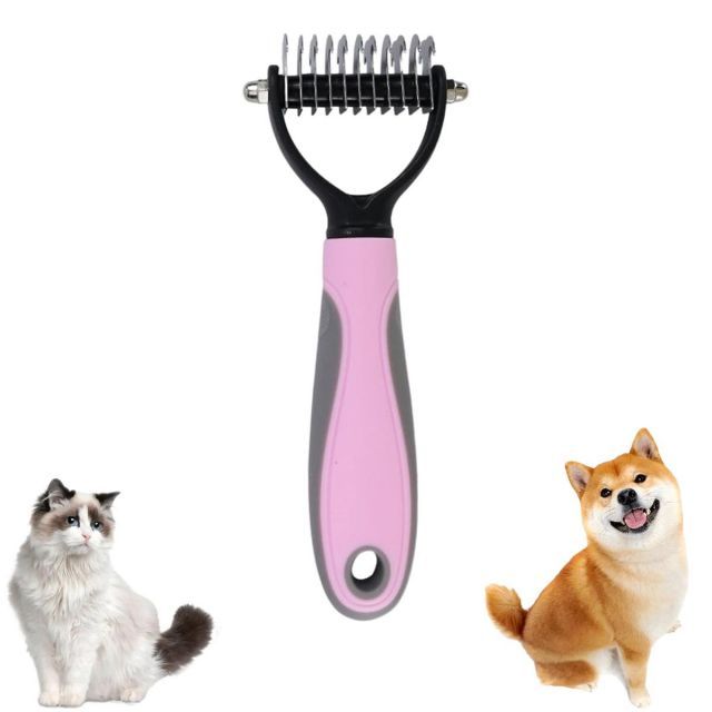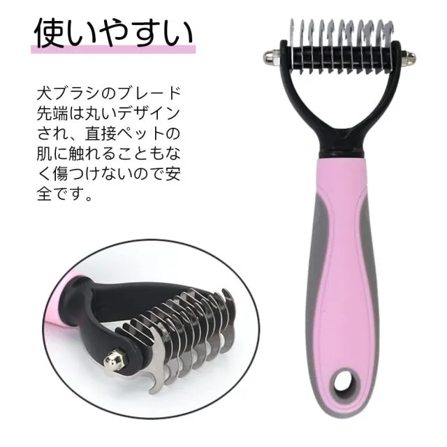 【両面歯デザイン】ペットブラシの11枚歯側で先にペットさんの結び目をカットし、ワンちゃんや猫ちゃんの抜け毛をしっかりと取り除き、ペットをより可愛くてきれいになります。