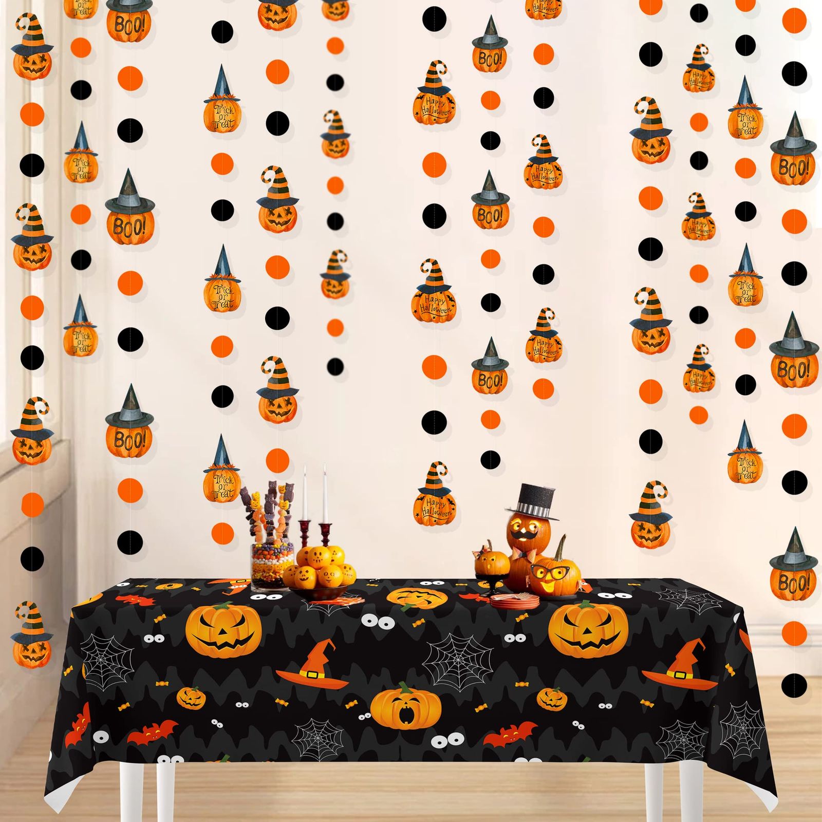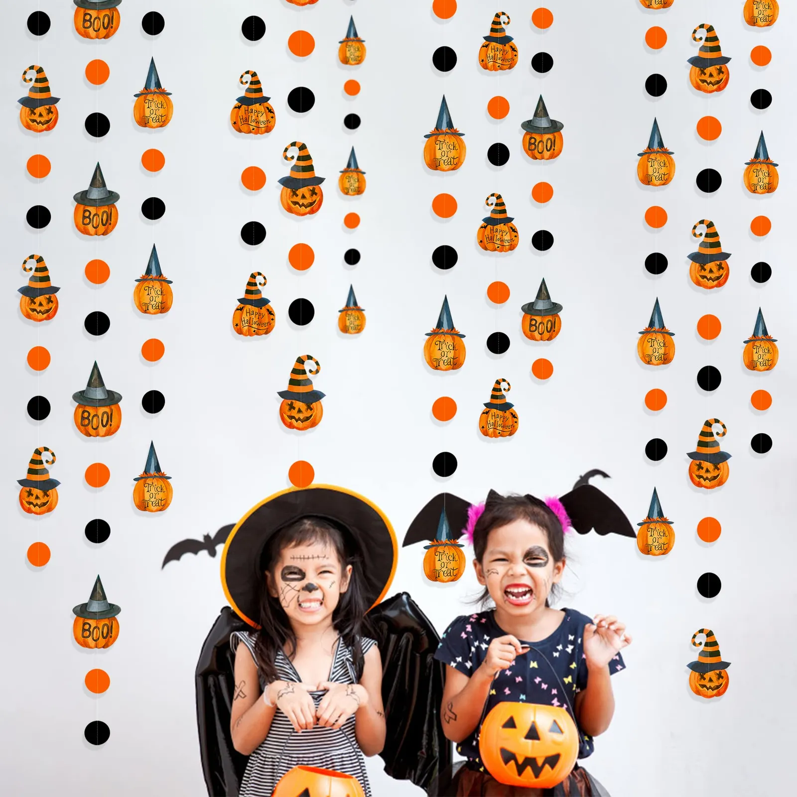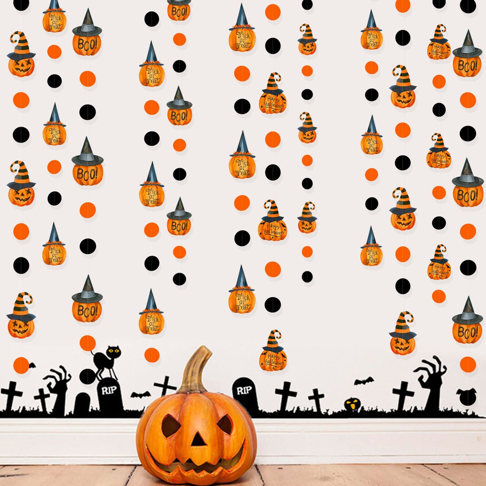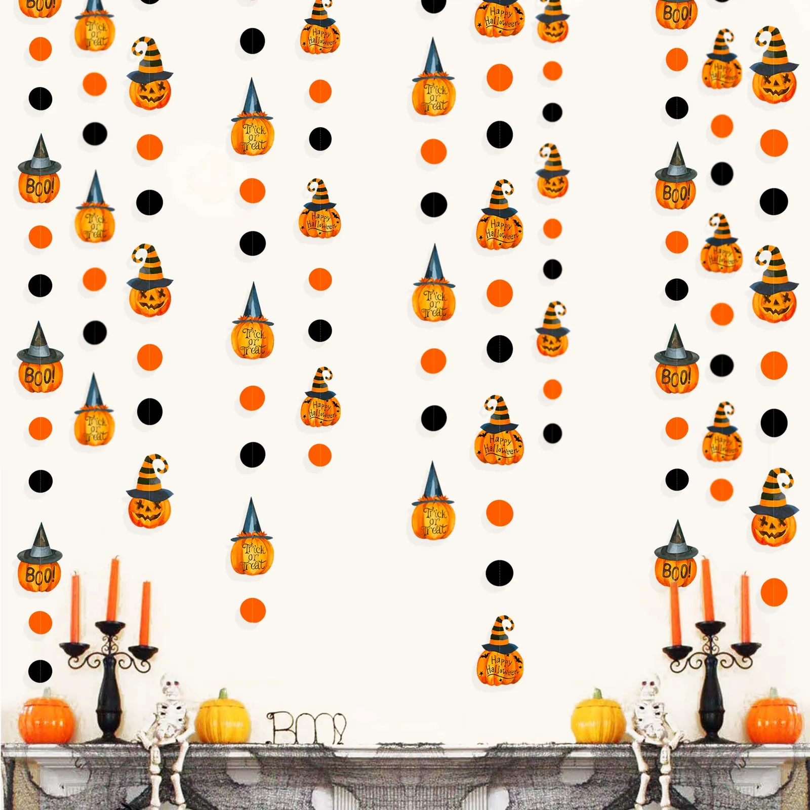 PinkBlume ハロウィンのかぼちゃの サークル ドット ガーランド パーティーの装飾 約12m長 オレンジ 黒 ハッピーハロウィン トリックオアトリート ブーサイン 魔女帽子 パンプキン ブラックオレンジサークルドットストリーマー付き 秋 ハロウィン 誕生日 パーティー 吊り飾りデコレーション用品