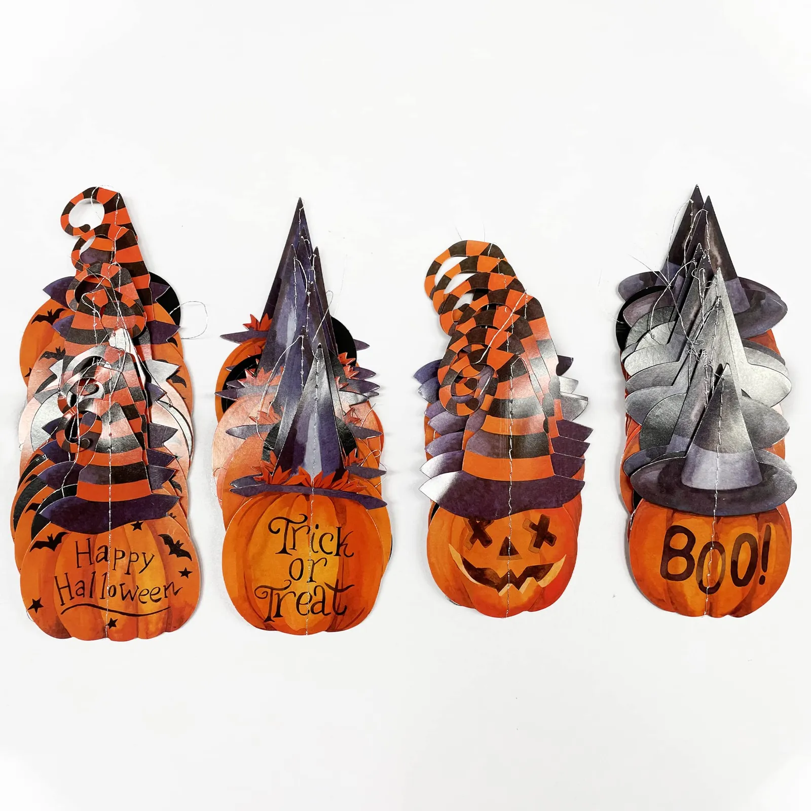 【ユニークなデザイン】ハロウィーンの古典的なカボチャの魔女の帽子のパターンデザインに、黒とオレンジの円のドット、さらにハロウィーンの古典的なサイン「トリック・オア・トリート」「ハッピーハロウィン」「BOO」。このパーティー ガーランドは、秋のハロウィン ホリデー パーティーの装飾をより特別で素晴らしいものにします。