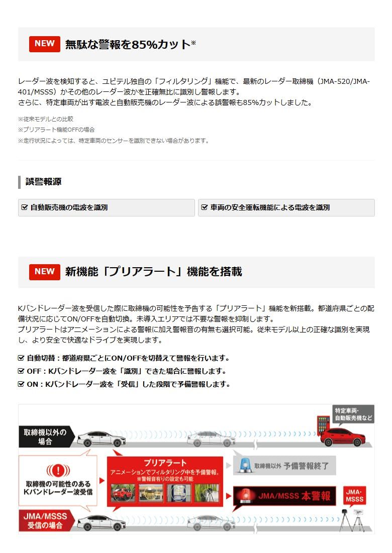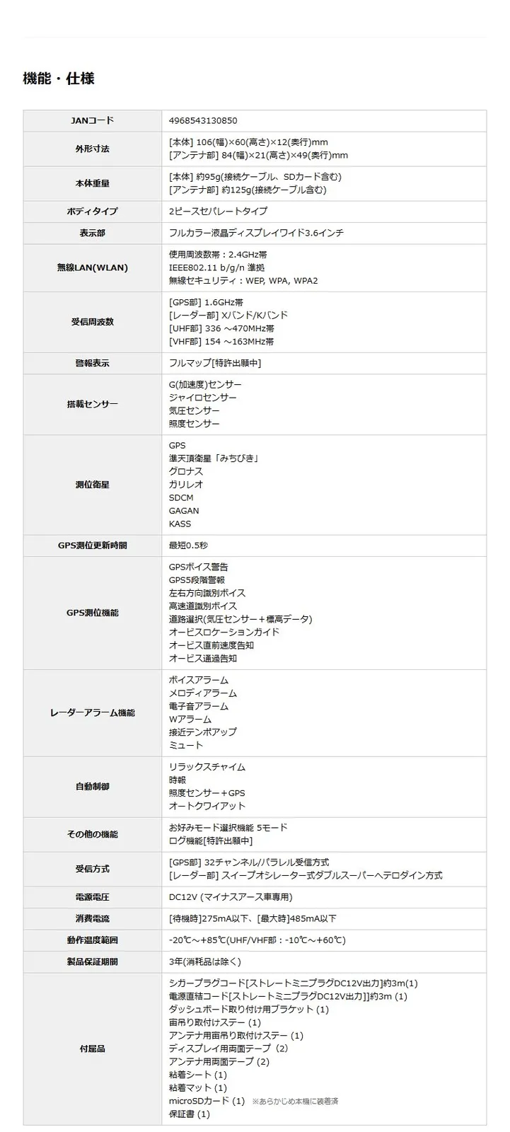 2025年無線LAN搭載型セパレートタイプ。レーザー式移動オービス「LSM」や新周波数を含むレーダー波可搬式オービス「MSSS」の受信/識別はもちろん、最新のKバンドレーダー式可搬式オービス「JMA-600(NTG-962)」「JMA-520」、レーダーパトカー「JMA-401」の識別と警報を実現、すべての取締機に完全対応(2025年現在)。業界最高水準の受信感度はそのままに、正確無比な「フィルタリング」機能で特定車両や自動販売機による誤警報も85%カット。「プリアラート機能」によりKバンドレーダー波をいち早く警告し、取締機と確定した時点で警報を最大化。高精度なマップマッチングで高架下やトンネルでも走行状況を判別。不要な警報を極限まで排除。高解像度3.6インチ画面。投稿機能で取締情報を登録・投稿。日本製&3年保証。12V車専用。シガープラグコード付属。簡易パッケージ&説明書ダウンロードタイプ。
