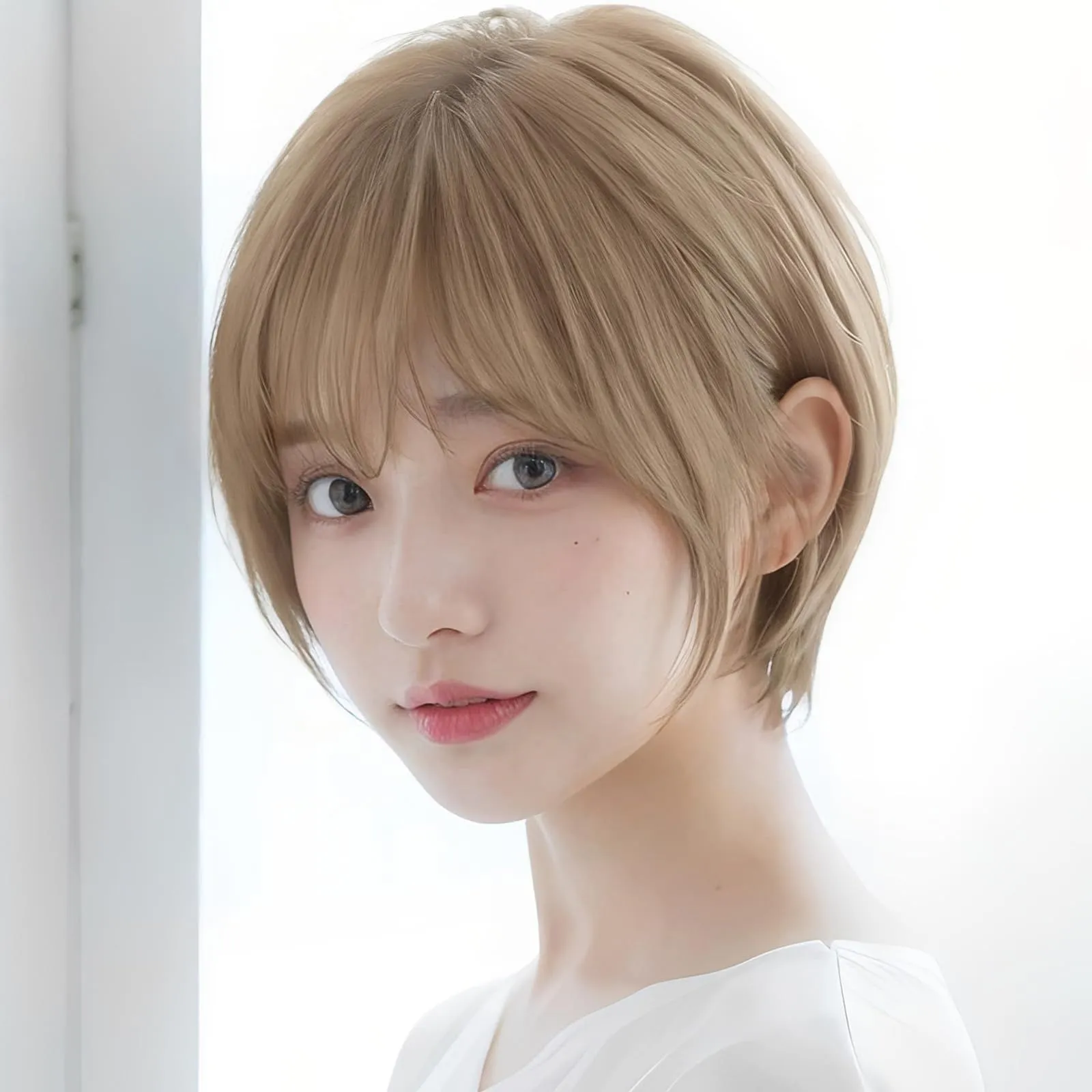 ヘアスタイルのスタイル:このヘアスタイルは、クラシックなショートヘアの要素を取り入れ、適度な前髪を合わせて、清潔感のある自然なスタイルを作り出しています。ショートヘアは顔の形を効果的に修正でき、特に丸顔や四角顔の方にとっては、顔のラインを引き伸ばし、より柔らかな輪郭を演出します。さらに、前髪の追加によってファッション感が増し、全体のスタイルがより活き活きとした印象になります。
