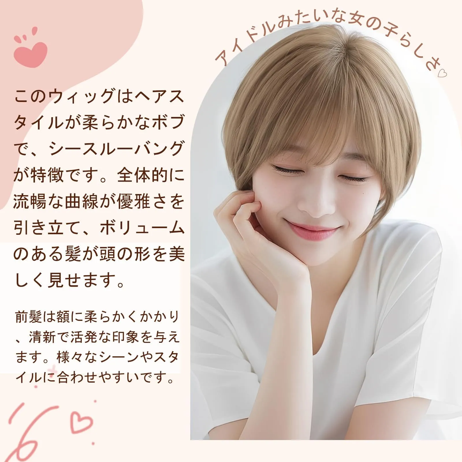 使用シーン:このショートヘアスタイルは、日常の仕事やリラックスしたデート、パーティーや職場など、さまざまな場面に非常に適しています。着用者に活力とファッション感を与え、さまざまなスタイルの服装と合わせることができます。また、このヘアスタイルはシャープで洗練された印象を与え、より明るく見せてくれます。