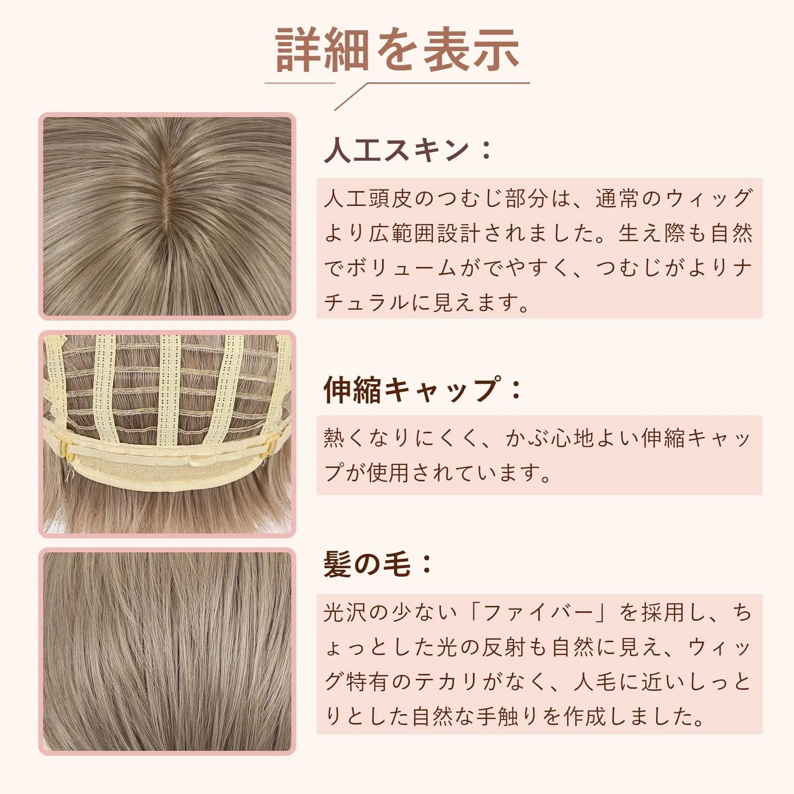 素材:このヘアスタイルは高品質な合成繊維を使用しており、耐久性と自然な感触を兼ね備えています。柔らかな手触りで、リアルな髪の光沢と質感をうまく再現しています。自然な髪と比較して、合成材料は洗浄や手入れが容易で、日常使用に適しています。