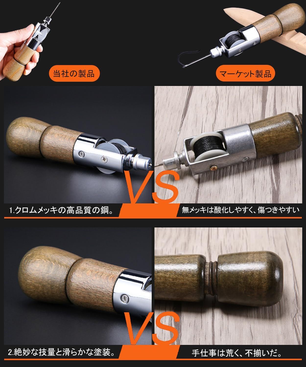 【快適な握り】木製の握りは心地よい感触を提供するだけでなく、握りながら追加の快適さをもたらします。これは特に硬い革を処理する際に重要であり、手にかかる圧力を軽減し、素材をスムーズに貫通できるようになります。長時間の作業でも手が疲れにくく、精巧で注意深い手仕事に集中できます。