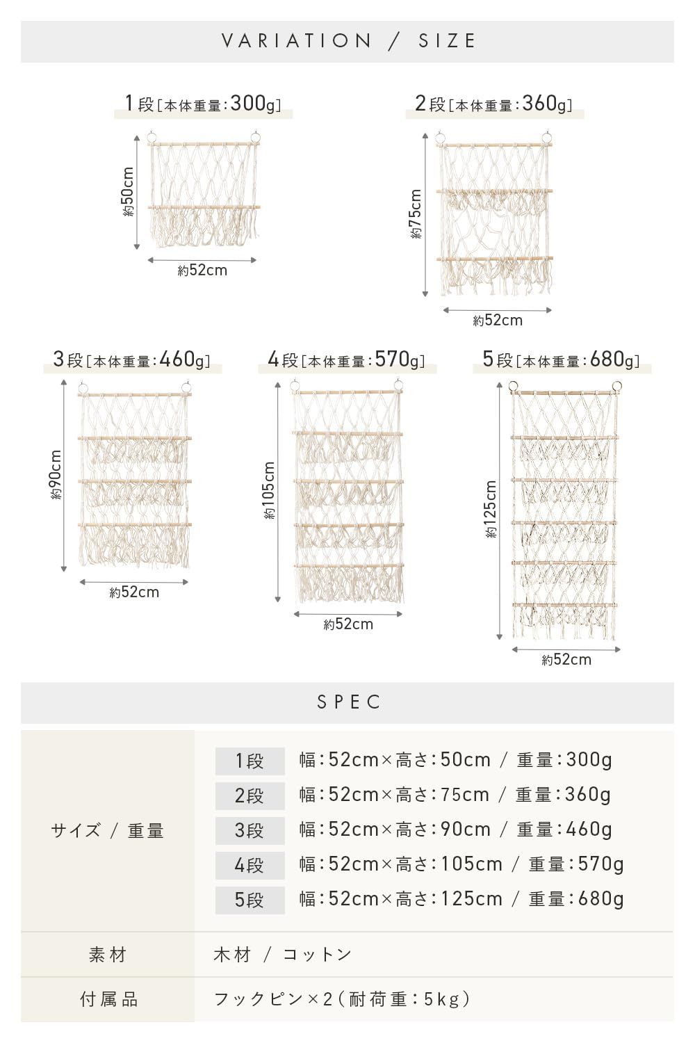 【段数×サイズ】お部屋のスペースや収納量に応じて、1段?5段から選べる豊富なラインナップ。1段:52cm×50cm(約300g)/ 2段:52cm×75cm(約360g)/ 3段:52cm×90cm(約460g)/ 4段:52cm×105cm(約570g)/5段:52cm×125cm(約680g)素材:木材・コットン。