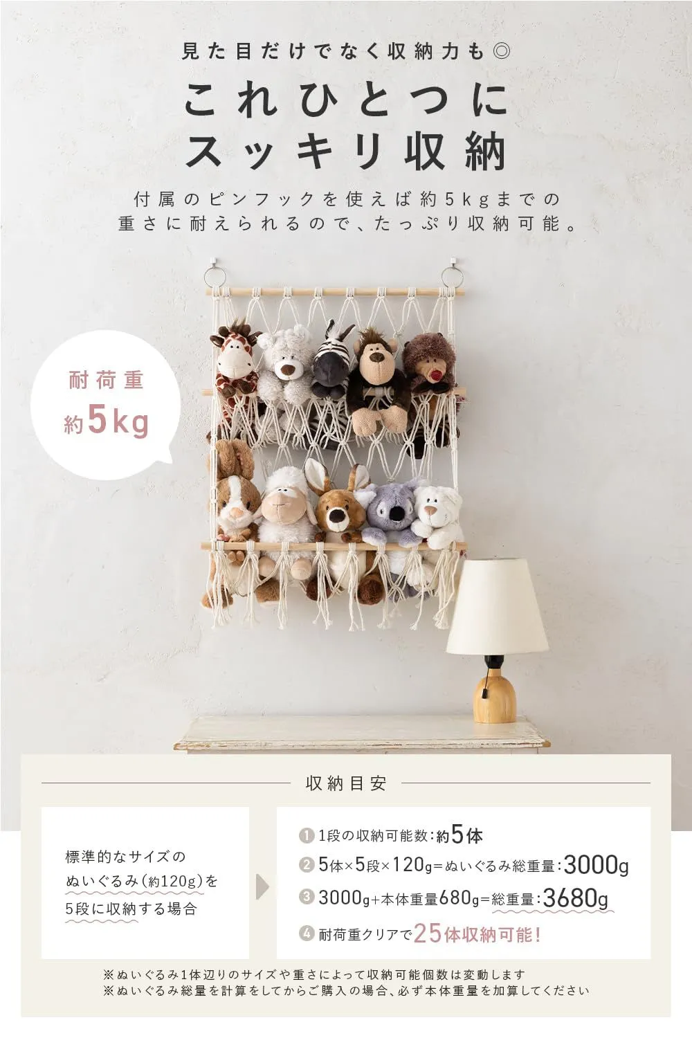 【穴が目立ちにくいピンフック付き】壁に大きな穴を開けずに設置できるピンフック付き。耐荷重5kgで石膏ボードやプリント合板などにも対応。賃貸住宅でも安心して使えます。ぬいぐるみやアパレル小物、雑誌などをしっかり収納。クロス貼りの壁にも対応し、届いたその日から取り付け可能な設置キット付き。
