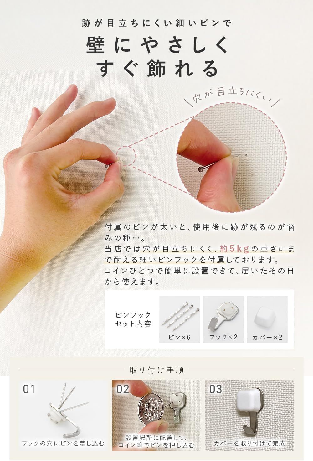 【注意事項】取り付け場所の材質によって、フックの固定強度が多少異なります。新建材(板壁など)の場合はハンマーのご使用をおすすめします。また、貴重品や壊れやすいものは掛けないでください。針の先端が鋭利になっていますので、取り扱い時のケガには十分ご注意ください。