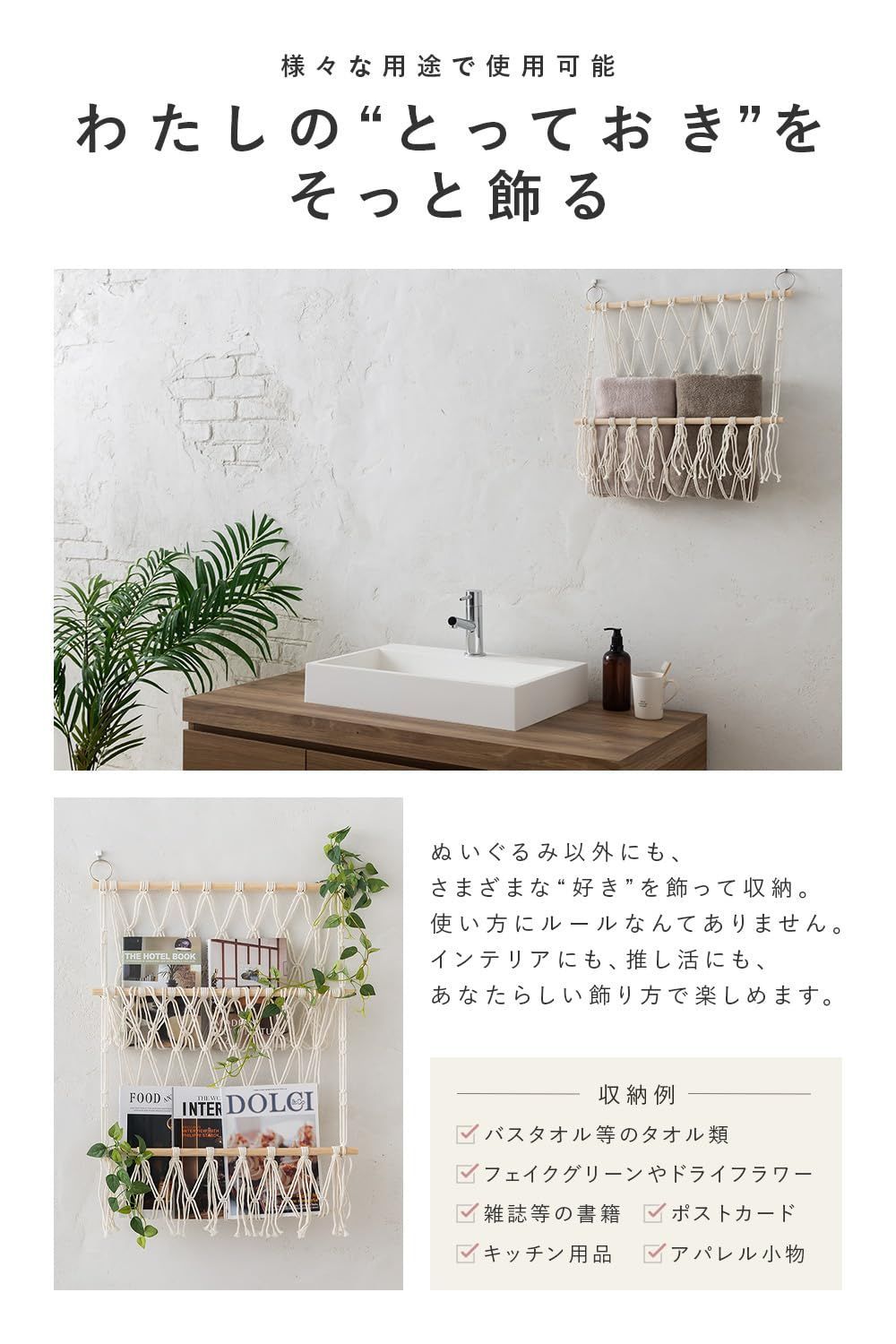 【様々な用途で使用可能】北欧風でナチュラルなネット素材は、どんなお部屋にも優しい雰囲気を添えるインテリア収納に。フェイクグリーンと組み合わせれば癒しの空間に早変わり。見せる収納としても使えて、男女問わず喜ばれるデザイン。誕生日プレゼントや新生活ギフトにもおすすめです。