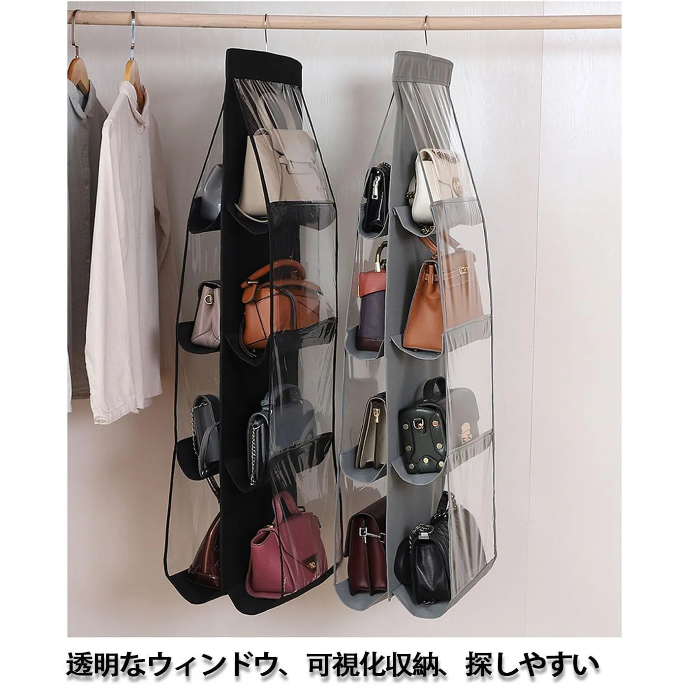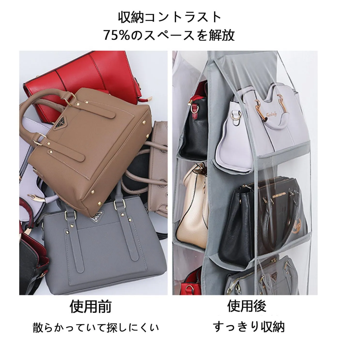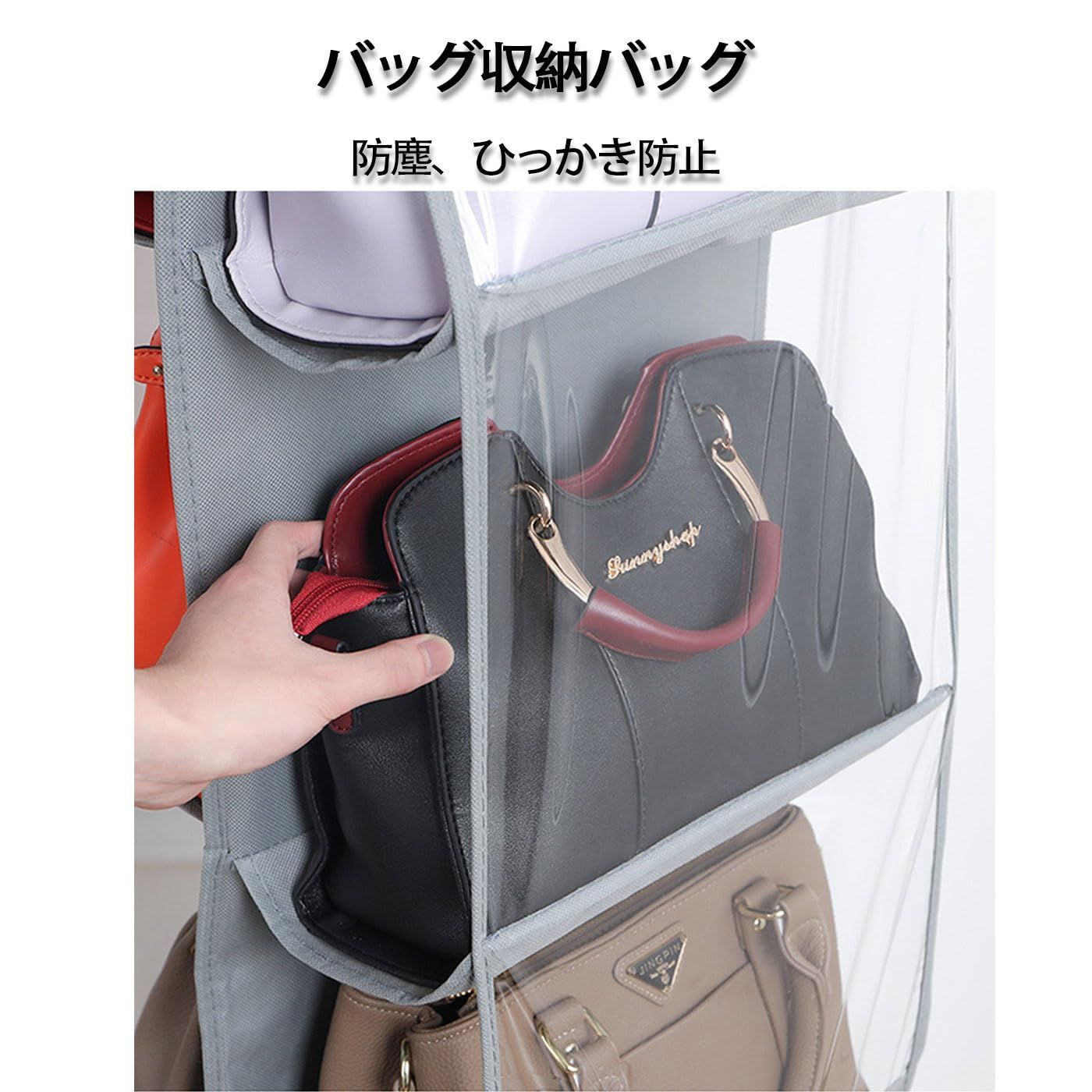 【透明窓で使い勝手抜群】収納物が一目で確認できる透明窓を備えています。さらに、横からの出し入れが可能なため、必要なバッグをすぐに見つけることができ、非常に便利です。また、ハンガータイプの設計で、引っ掛けるだけで簡単に取り付けることができます。
