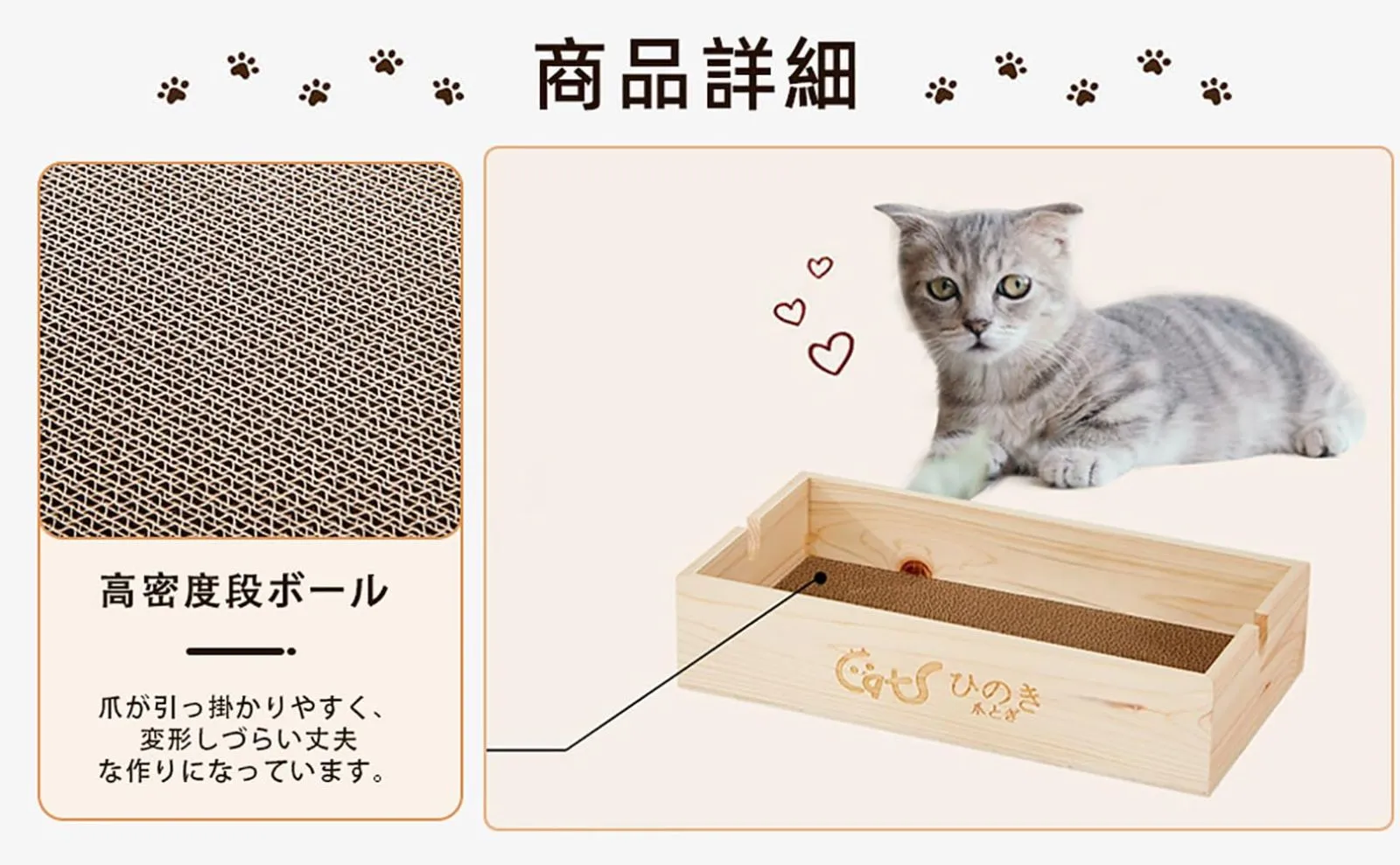 【長持ち】耐久性に優れる高密度段ボールを採用。通常の段ボールの約2倍の強度を誇り、研ぎカスが飛び散りにくく、耐摩耗性・耐久性に優れています。一般的な爪とぎより長くご使用いただけます。