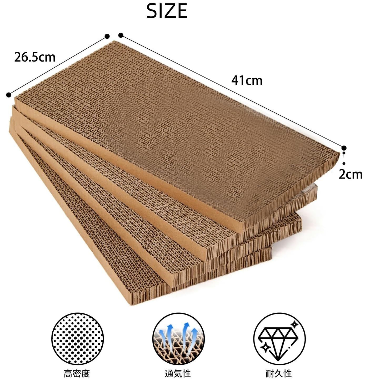 【商品情報】交換用段ボールサイズ:約41×26.5×2cm、数量:4枚入り(1箱に2袋の個包装が入っており、各袋に猫用爪とぎ替え板が2枚ずつ入っています。合計4枚セットです)。※ご購入前に、お使いの爪とぎケースの内寸をご確認ください。