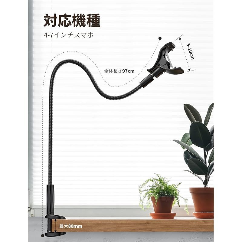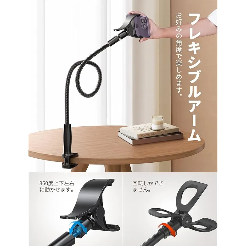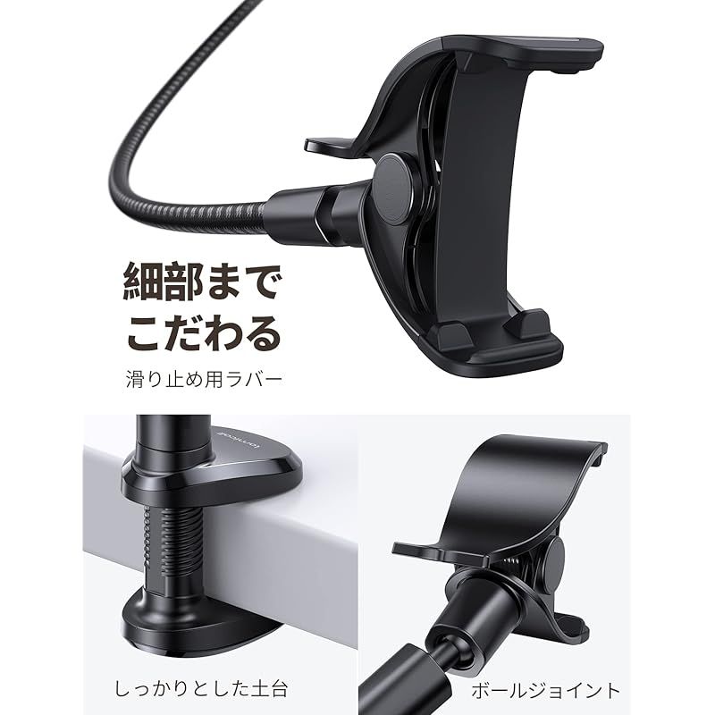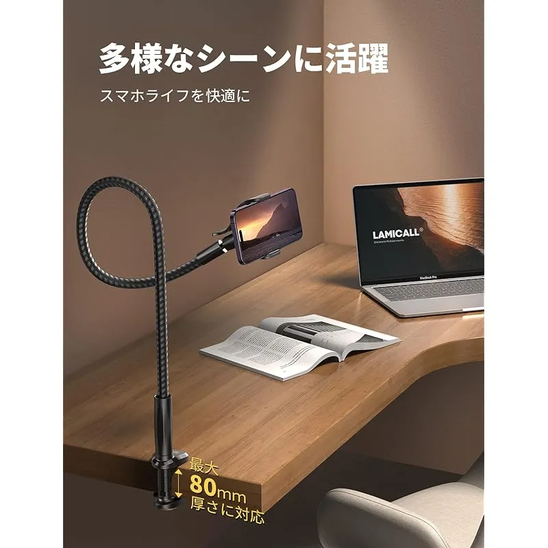 【?幅広い土台・安定感満々】土台の最大対応厚さ:80mm。普通モデルのスマホスタンドは土台のところが弱すぎで壊れ易く、スマホが支えきれなくなる状況が発生いたしましたが、弊店のスマホスタンドは、土台の厚さを倍にすることで強度が増しました。ナイトテーブルやオフィスデスク、ベッドボードなどいろんな場所に対応できます。テーブルに接触する面に滑り止め用のシリコン製パッドを設けて、安定感が増えるだけではなく、机や家具を傷からきちんと守ります。耐衝撃性の高いABS樹脂素材により、また良い耐熱性や耐低温性に加え、安定性に感心できます。注意??:本製品は車載ホルダーではなくて、車などの走行中の揺れは、スタンドアームの揺れを招き、不快感を与えますので、車や長距離バスでの使用はおすすめません。