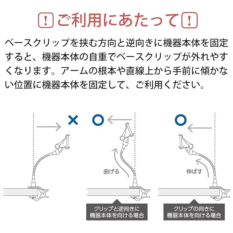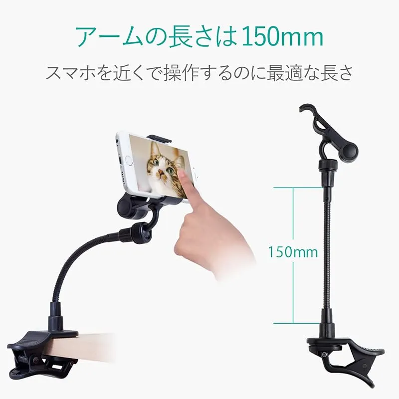 リビング、ベッドルームのサイドテーブルや、オフィスのデスクなどお好みの場所にスマートフォンを設置して、自由な角度で使えるクリップ式アームスタンドです。