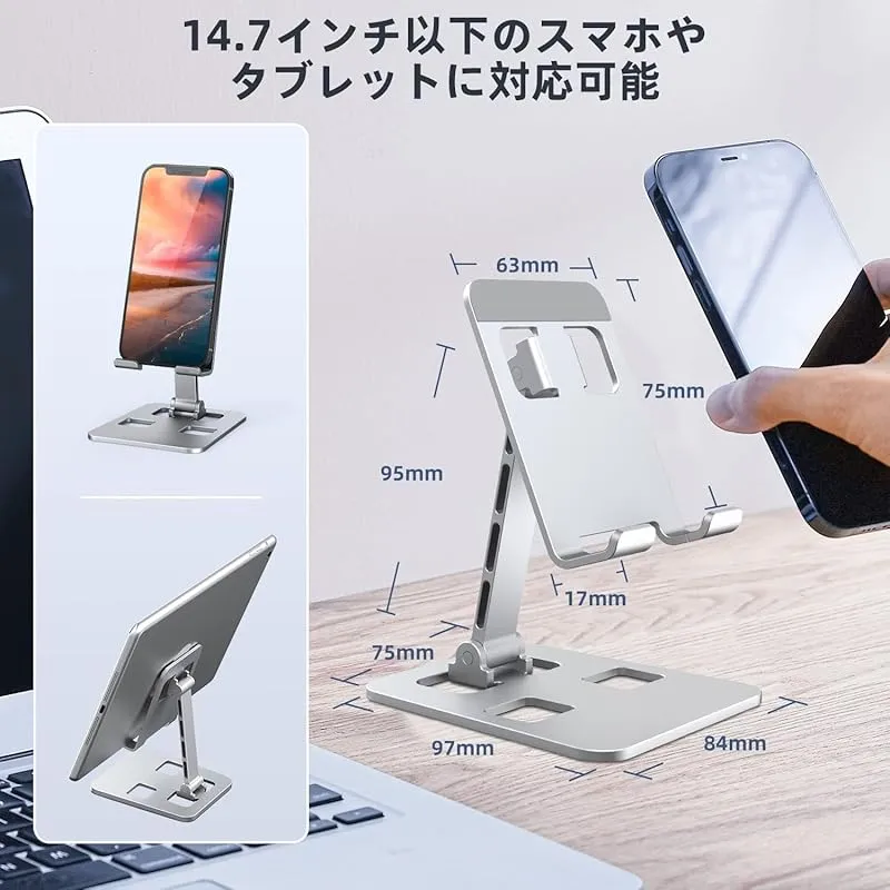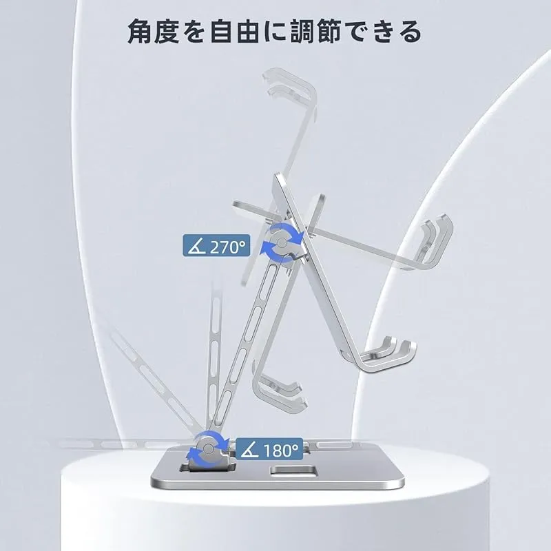【折り畳み式あので持ち運び便利・使用中に充電可能】携帯スタンドは軽くて耐久性が高いアルミ材料を採用し、未使用時にコンパクトで折り畳めるものがおすすめ、持ち運び便利でスペースを節約できます。スマホを置いたまま充電もでき、キッチンやベッドルームやオフィスデスクや食卓など、どこでもいつでもいろんな場面で使用ができます。