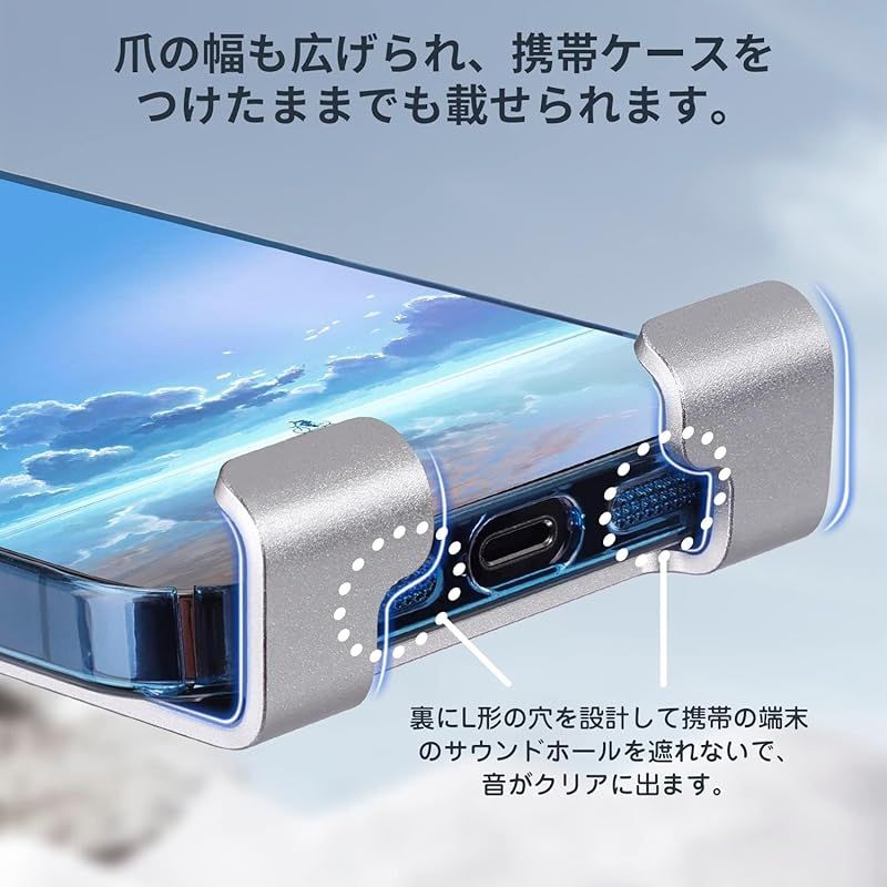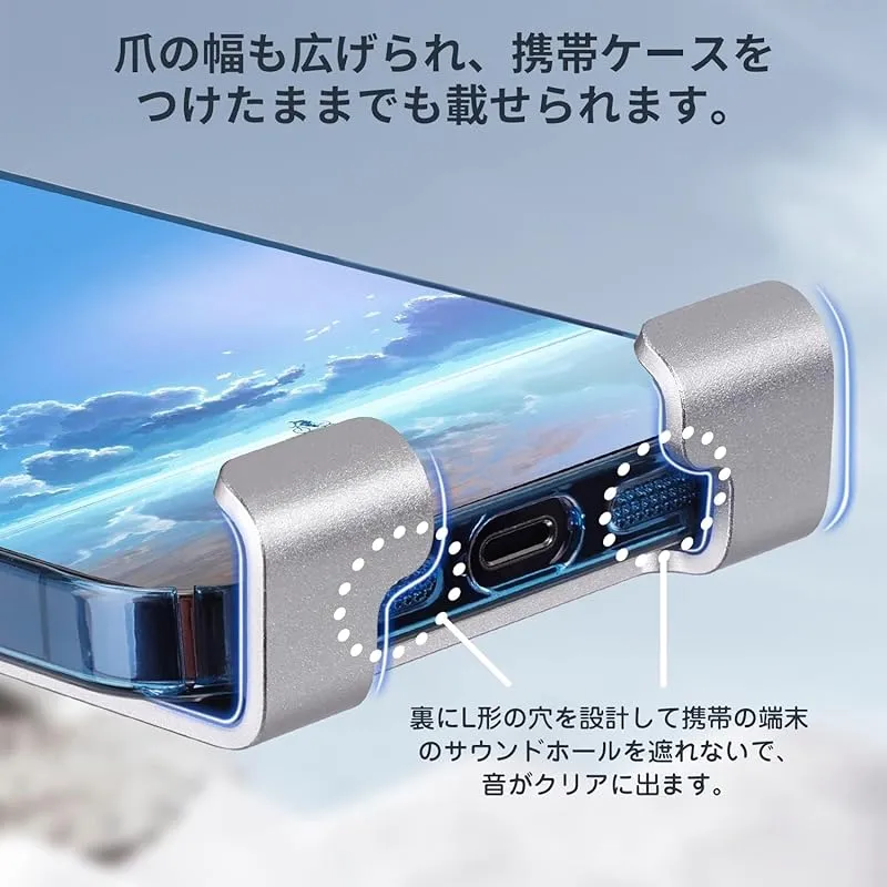 【高品質を表現していて、底面と爪を広くする】このスマホスタンドはアルミ合金一体成型、精密な仕上がり、 耐久性と強度性が高いアルミを採用し、シンプルとおしゃれ、角が丸められており、机に滑り止めの設計、スタンドの高級感を感じさせてられます。底面を広げて重量感があり大型タブレットを置いても安定しています。爪の幅も広げられ、携帯ケースをつけたままでも載せられます。爪の裏にL形の穴を設計して携帯の端末のサウンドホールを遮れないで、音がクリアに出ます。