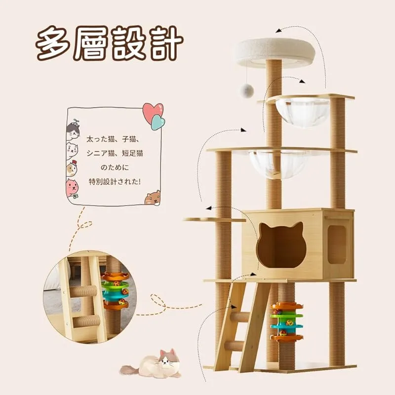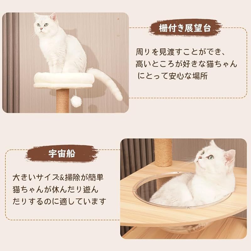 猫ちゃんの遊び場:室内用キャットタワーは、運動、エンターテイメント、休息が一体となった遊び場です。360度の視野が透明な宇宙船、木製の展望台や隠れ家など、リラックスできるスペースが備わっています。ぐらつき軽減のため、土台に滑り止めパーツを使用。猫ちゃんが安心して遊べます。