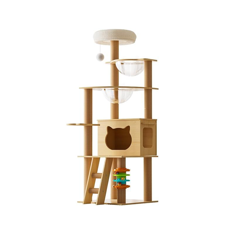 Elegaif キャットタワー 木製 猫タワー スリム 大型猫用 140cm 据え置き 省スペース 透明ボウル 宇宙船付き 多頭飼い 猫ハウス 太った猫 シニア猫 短足猫 子猫向け 見晴台 頑丈 安定感 天然麻紐 多ステップ 階段付き 爪とぎ 運動不足解消