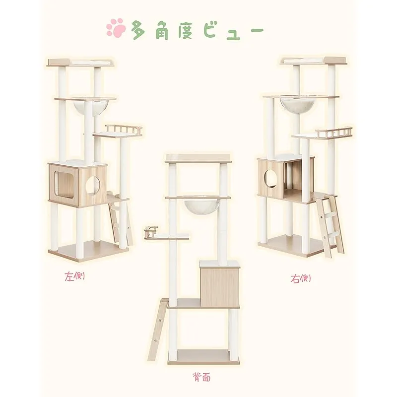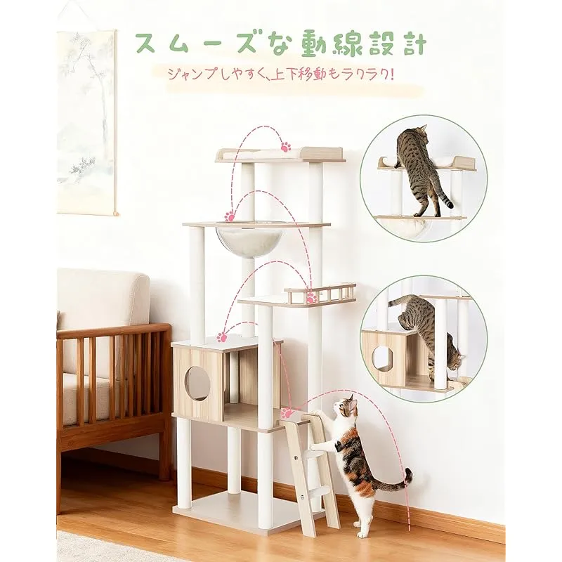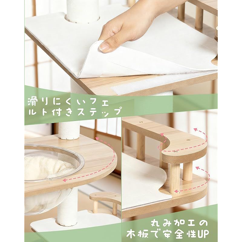 短足猫や老猫、ぽっちゃり猫にも優しい据え置き型キャットタワー。段差を低めにし、広めのステップで安全に上下運動をサポート。360度見渡せる宇宙船ハンモック、居心地のいい猫ハウス、安定した展望台で遊ぶ・休む・眺めるを一台で実現。綿ロープ爪とぎポストはストレス解消&家具保護に効果的。ナチュラルウッド調のデザインは日本の家装に自然に溶け込み、リビングに置いてもおしゃれ。大型猫や多頭飼いにも安心の安定感。