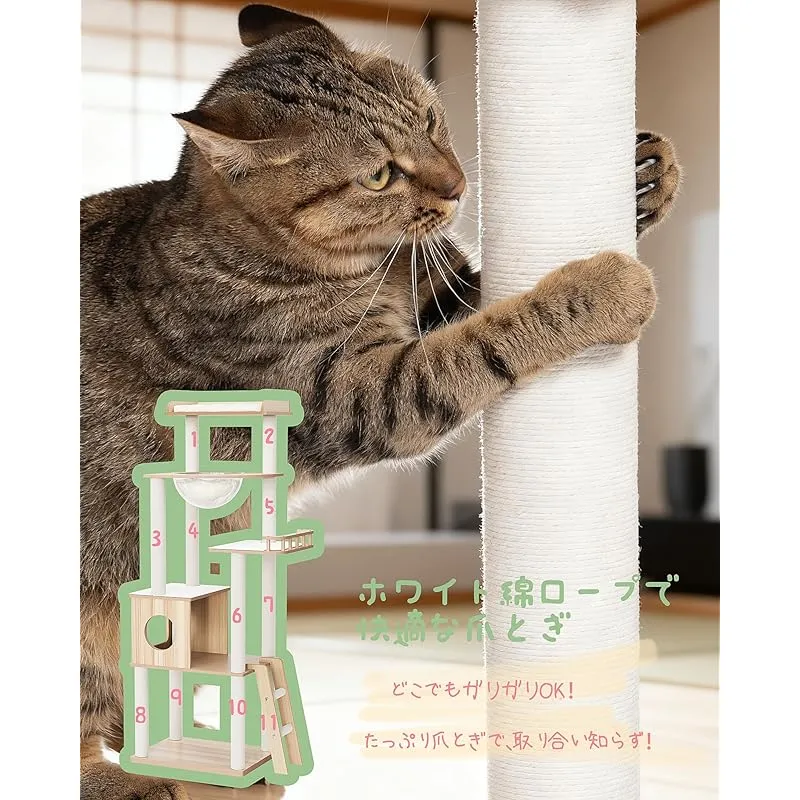 【頑丈な爪とぎポスト付き】極太支柱にホワイト綿ロープをしっかり巻き付け、耐久性抜群。毎日の爪とぎに最適で、猫のストレス解消を助けると同時に、ソファや壁など家具のキズ防止にも役立ちます。