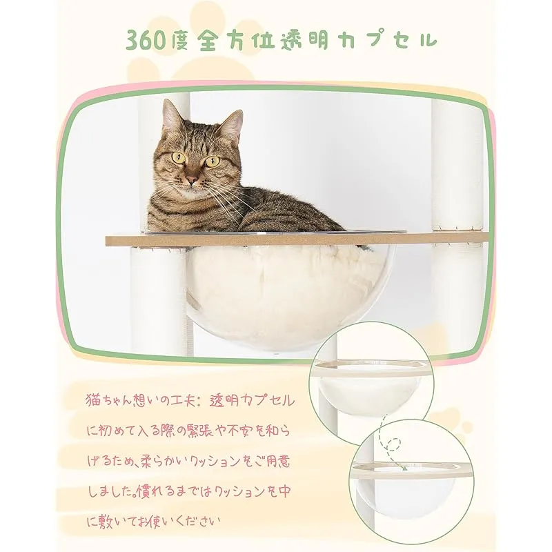 【遊び・休憩・眺めを一台で実現】宇宙船カプセル(直径30cm)、展望台、猫ハウスを組み合わせた多機能キャットタワー。運動不足解消、リラックス、お昼寝、外の景色を眺めるなど、猫の欲求をすべて満たします。高さは158cmで、猫ちゃんが窓辺から外を眺めるのにも最適です。本体サイズ:幅54×奥行40×高さ158cm