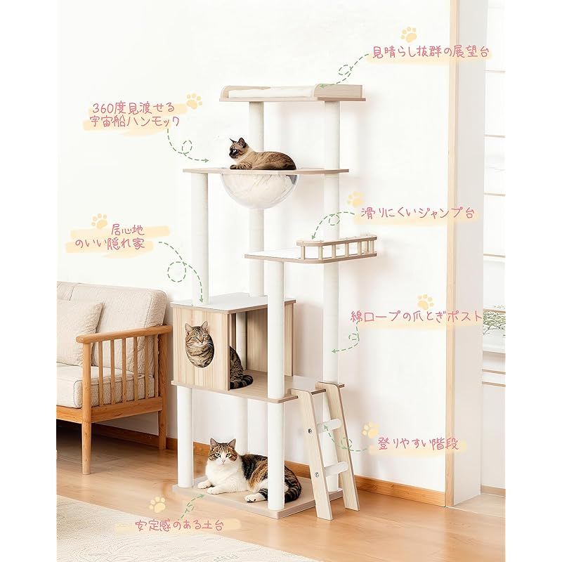 商品名:OROPY キャットタワー 据え置き型 木製 157cm 5段猫タワー 多頭飼い 大型猫対応 短足猫 老猫 太り気味猫に優しい 宇宙船ハンモック 隠れ家 展望台 爪とぎポスト 階段付き