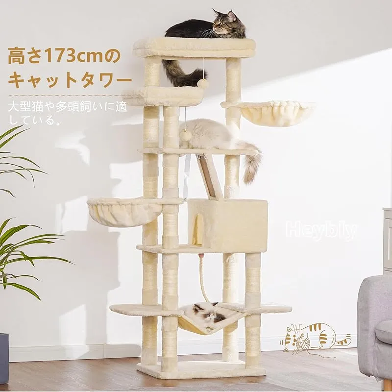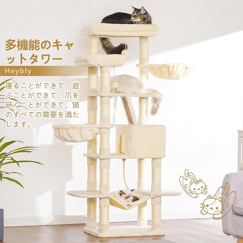 商品名:Heybly キャットタワー 大きな猫や多頭飼い 超スリム 据え置き型 省スペース 登りやすい ハンモック2つ 大きな見晴らし台 天然麻紐 爪研ぎ棒 高さ173cm ベージュ HCT025M