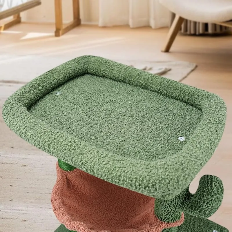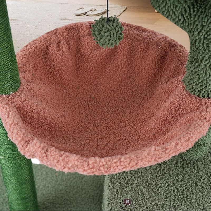 ハンモック・ボンボンおもちゃ・爪とぎ板・二つの猫ハウス、支柱の表面は麻縄巻き(サイザル麻100%)、高台には充填物があり、猫用ベッドにもなります。 猫ちゃんの好みに合わせて多彩な要素を用意しています。