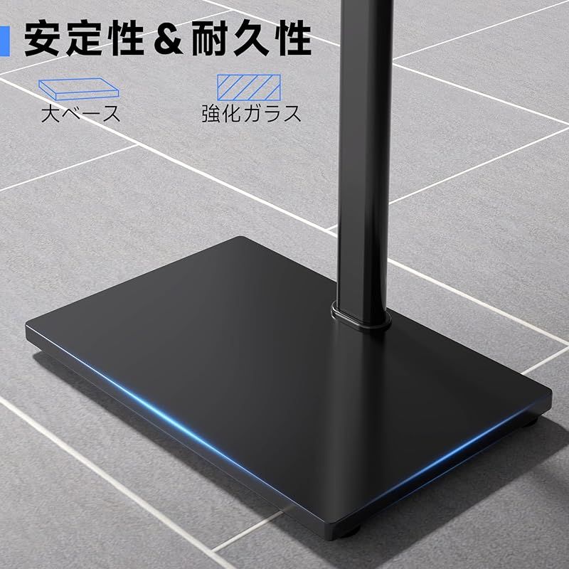 【安定性抜群】台座は強化ガラスを採用して横幅60cm、奥行39.8cmと広くとられていて見栄えが良いだけではなく、耐久性に優れて月日を経ても新しい状態を確保できます。安定性も抜群テレビが倒れるような不安がありません。支柱とパネルは高品質の冷間圧延鋼がコア材料で、安定性をより確保しました。40KGの最大耐荷重で市販のほどんどテレビやモニターに対応できます。