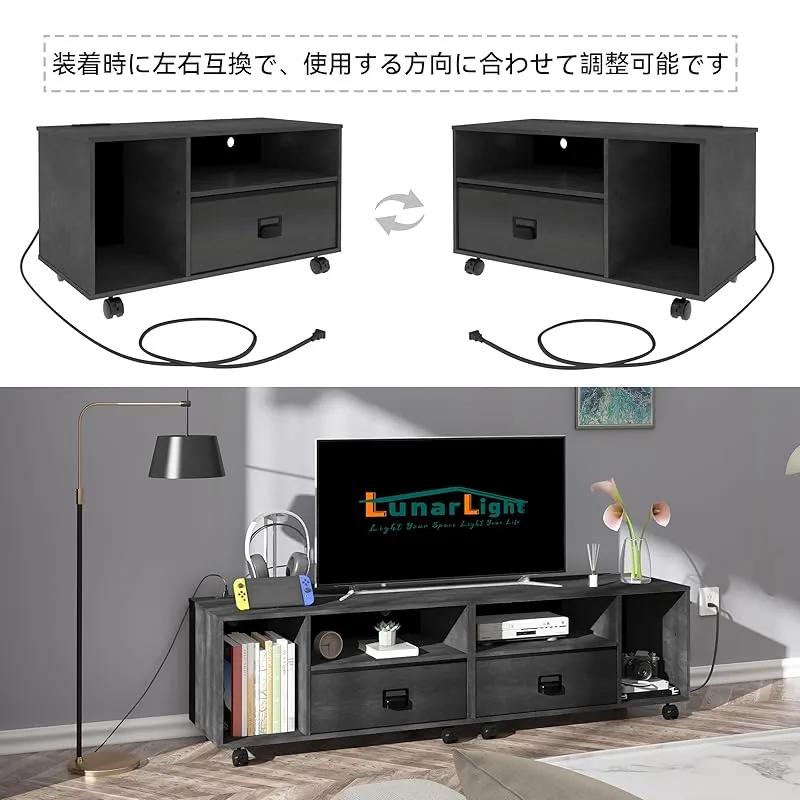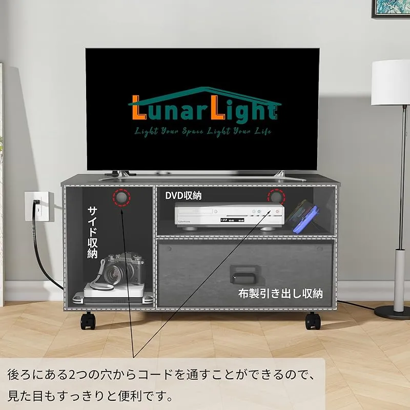 テレビ台としても、ローボードとしても活躍する多機能収納家具。左右のパーツは組み立て時に入れ替え可能なので、設置場所やお部屋のレイアウトに合わせて自由にアレンジいただけます。 下には大容量の不織布引き出しが付属しており、日用品や雑貨をすっきり収納。引き出し上部にはDVDプレーヤーやゲーム機などが置けるオープンスペースも配置されています。左側は高さいっぱいまで使える縦型の収納棚となっており、本や雑誌、ディスプレイ小物の収納にも最適です。 さらに、天板には2口コンセントが付属しており、テレビや照明、スマートフォンの充電などに便利です。 背面には配線用ホール(コード通し穴)を2カ所設けており、テレビや周辺機器のケーブル類もスマートに整理可能。見た目もスッキリ、配線のごちゃつきを防げます。本体下部にはストッパー付きキャスターを採用しており、移動や掃除の際にもラクラク。必要なときには固定もできるので、安定感も抜群です。 シンプルかつ機能性に優れたデザインで、リビングやワンルームにも馴染みやすく、「見せる収納」と「隠す収納」を両立。省スペースながらも高い実用性を兼ね備えた一台です。