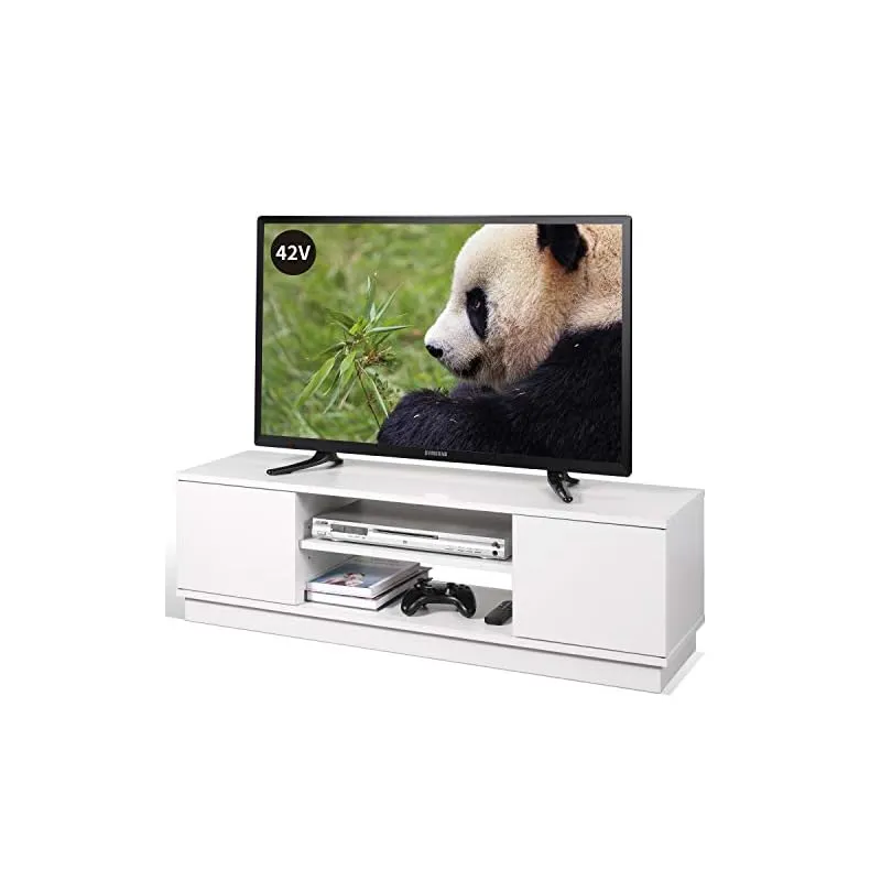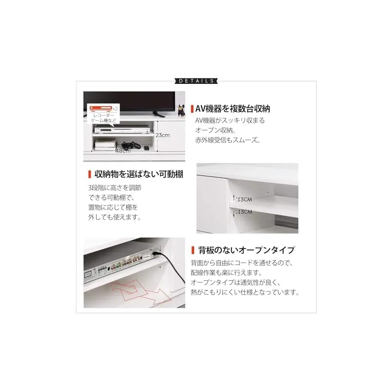 収納付きテレビ台:このシンプルなテレビ台は見た目に反して、驚くほどの収納力を持っています。扉付きのデザインは引き出しのデザインより、収納容量はもっと多く、組み立ても簡単で、わずかな収納スペースも無駄にしません。中間の棚板は約48cmの幅広で、上下2層にデザインされているため、限られたスペースに2台の機器を共に置くことができます。また、中間の棚板は3段階高さ調節できるため、収納物の高さに合わせて調節が可能で、さまざまな用途に対応します。背板のない仕様は、通気性がよく、配線収納にも便利です。