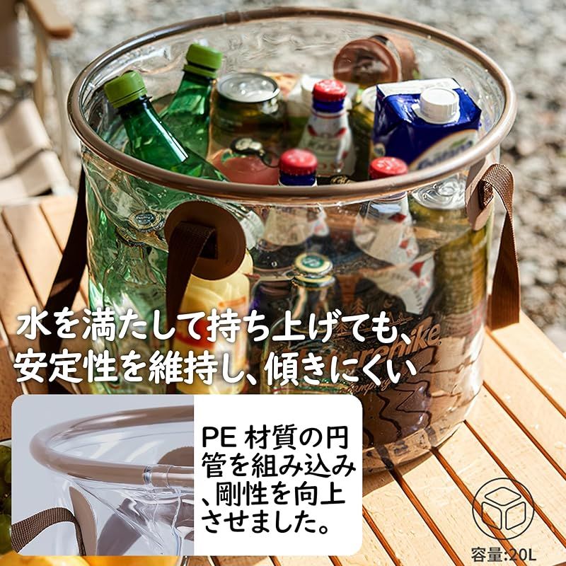 【透明多用途折りたたみバケツ】クリアデザインで内容物が一目了然!清潔感溢れるモダンなデザインと実用性を兼ね備えた、アウトドアから日常まで活躍する折りたたみバケツです。10L/20L の 2 種類の容量から選べ、キャンプでの飲料・果物収納、野菜・食器洗浄はもちろん、家庭内での収納容器としても最適です。大開口構造により、手軽に物を出し入れでき、使い勝手を大幅に向上しました。