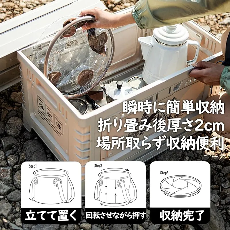 【超コンパクト収納】水タンク使用後は簡単に押圧するだけで折りたたみ、厚さわずか 2cm、重量 310g のスリムデザイン!車内やキャンプグッズの収納スペースにすっぽりとフィットし、不使用時のストレージ負担をゼロに近づけました。アウトドア:キャンプ・ピクニック・フェスティバルでの飲料サーバーや洗浄バケツとして、果物収納・水物の冷やし容器・ゴミ箱代用として、パーティーでのアイスバケツや装飾用容器としてもおすすめです。