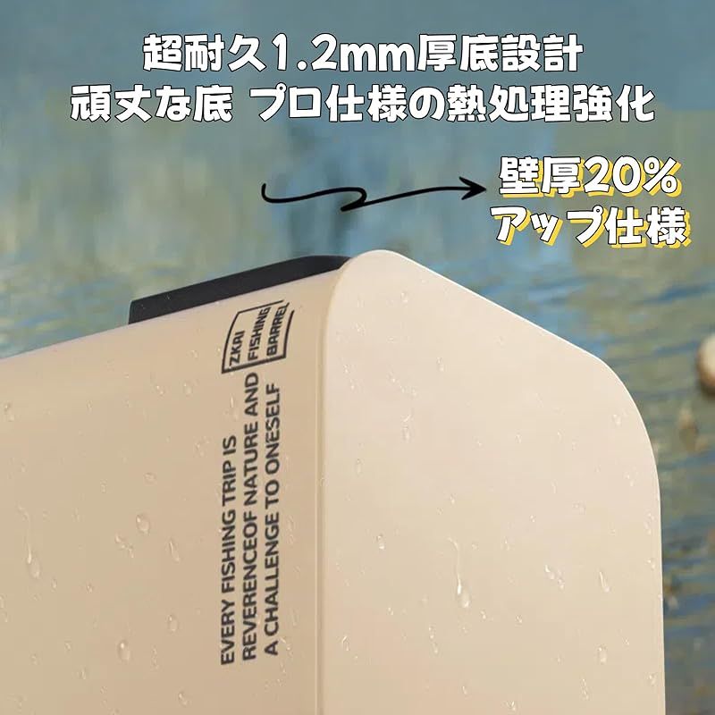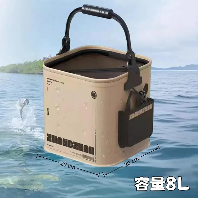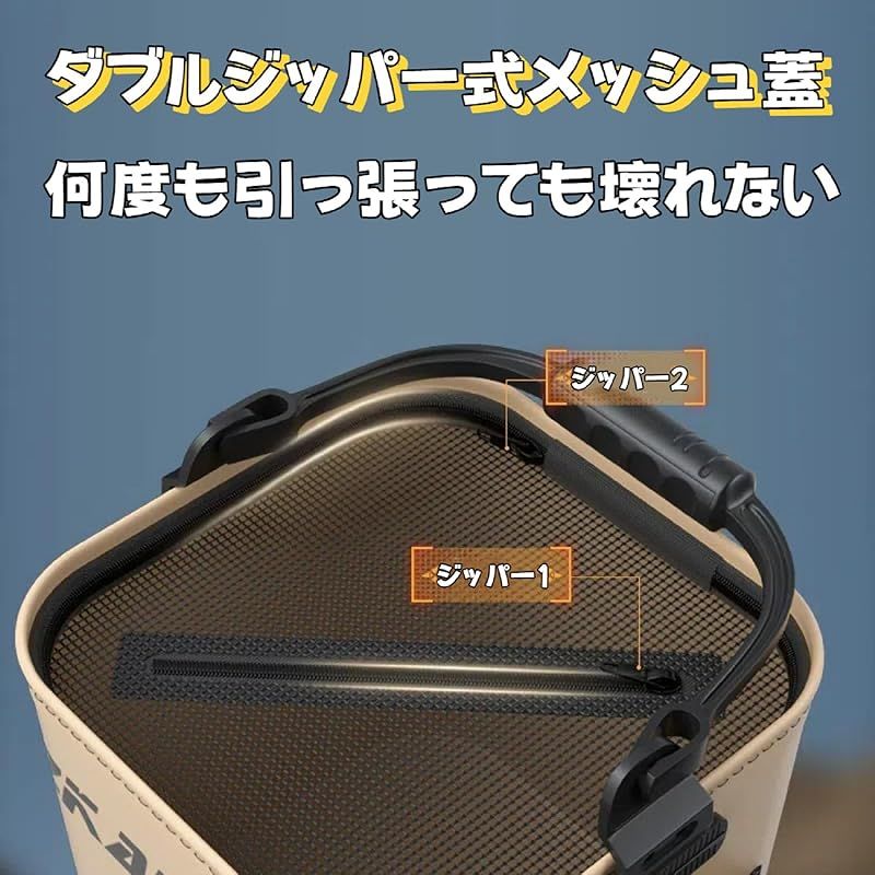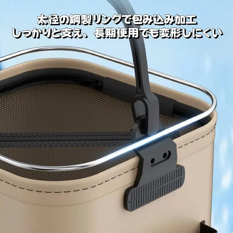 ?デザイン:8Lの大容量収納に加え、サイドポケットで酸素ポンプ、餌や小物を収納できる。5m打水ロープ付きで、生きた魚を長時間保管や道具洗浄も楽々。