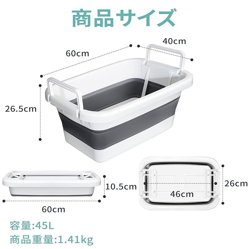 素材:高品質PP+TPR材料で作られ、サイズ:容量は45L(約)展開サイズは縦60cm*横40cm*高さ26.5 cm、折りたたみサイズは縦60cm*横40cm*高さ10.5 cmです。重量は約1.41kg。