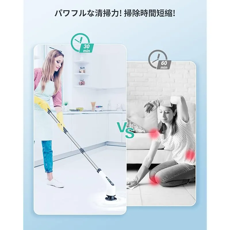 【 二つ回転モード&無線式】電動お掃除ブラシは400RPMと300RPMという2段階の回転速度を搭載し。電源ボタンをオンにして、ボタンを短く押してモードを切り替えます。フロアバスルームクリーナーを使用してください 頑固な汚れでも簡単に取り除き、掃除時間も短縮し、時間を節約できま。そして、電動お掃除ブラシはコードレスの設計で、電線に邪魔せず、どこでも自由に掃除できます。(ご注意:充電中、使用できません)