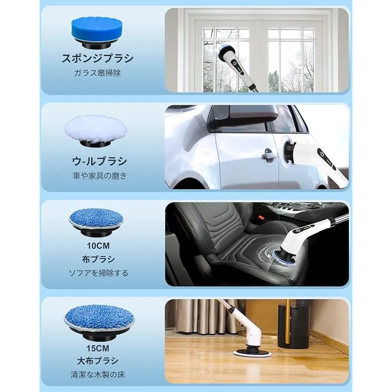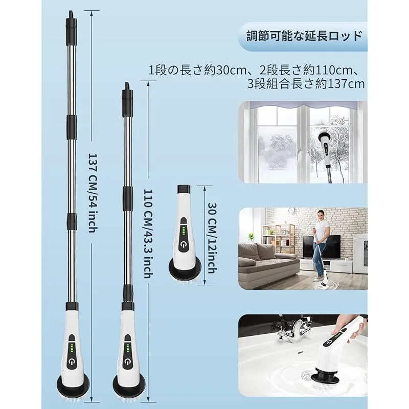 【 8つの替えブラシ&取り外せる3段式設計】8つの替えブラシと3つの長さ(30~137CMに調整できます),さまざまな組み合わせにより、プロセスのクリーニングの難しさが解決します。掃除を楽にし、人生をもっと楽しくします。フラットブラシは、浴室の床や、バスタブ、更に小さいフラットブラシで洗面台やトイレ掃除にも適応。コーナーブラシは壁のコーナ、ドアの隙間などの場所の掃除に適用。スポンジブラシは窓ガラスや、自動車のガラス窓に適応。布ブラシはフローリングの床などに適応。ウールブラシは、ソファーや車磨きに適応。ファイバーブラシは、キッチンの油汚れに適用。