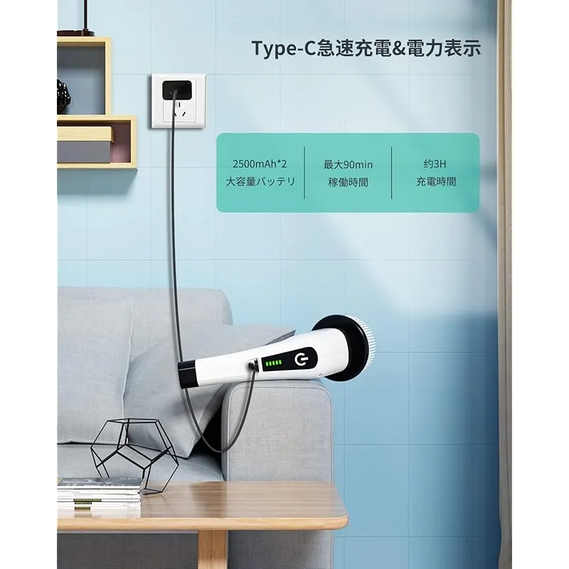 【 大容量電池 & USB-C急速充電器 】電動お風呂掃除ブラシは2500mAh×2の大容量バッテリーを USB-Cケーブルが付き、ACアダプターまたはPCを使用して充電できます。大容量バッテリーが内蔵し、充電時間が大幅に短縮され、一回のフル充電はただ4時間がかかり、約90分間までの連続稼働ができます。