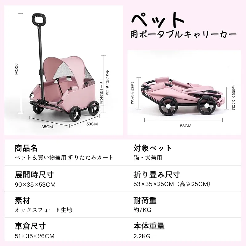 【仕様】犬カート展開サイズ(約):長53cmx幅35cmx高さ90cm 収納サイズ(約):長さ53cmx幅35cmx高さ25cm 本体重量(約):2.5KG フレーム:たんそこう 生地:オックスフォードポリエステル