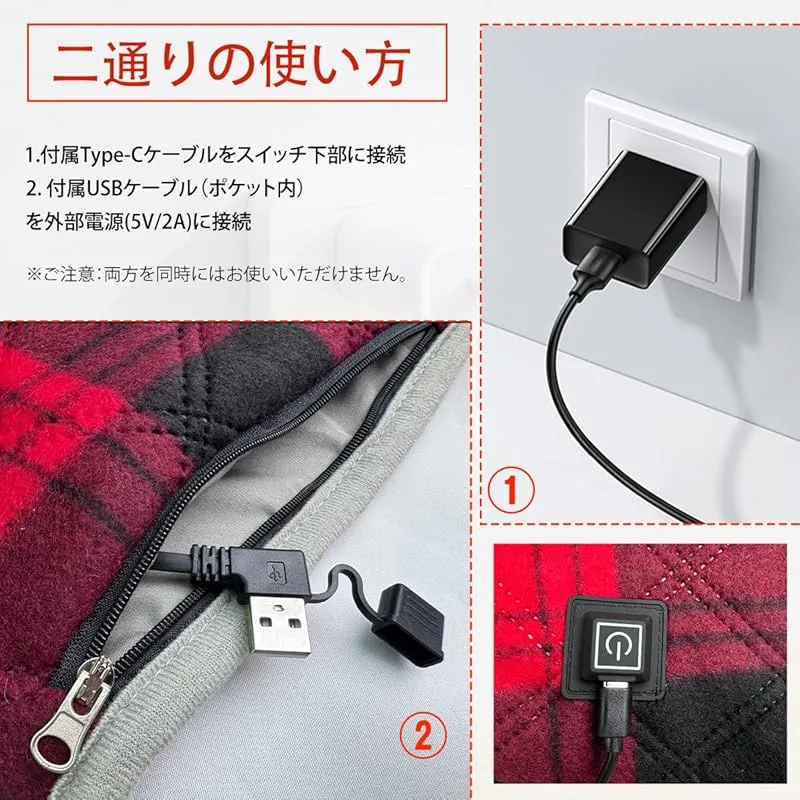 ??簡単操作??:電気座布団は電源のON/OFFだけのシンプル設計。35℃、45℃、55℃の3段階温度調節が可能なため、どなたでも簡単にご利用いただけます。本体に組み込まれたUSBケーブルと付属のType-Cケーブルのいずれかを使用して、ACアダプターやモバイルバッテリーなど、お好きな電源でお使いいただけます。