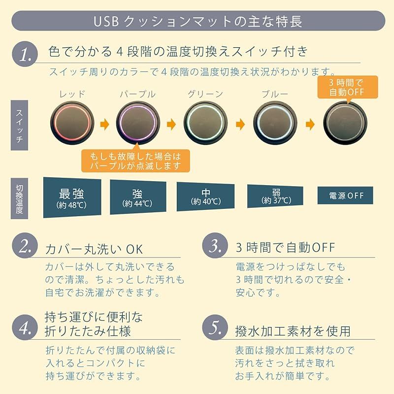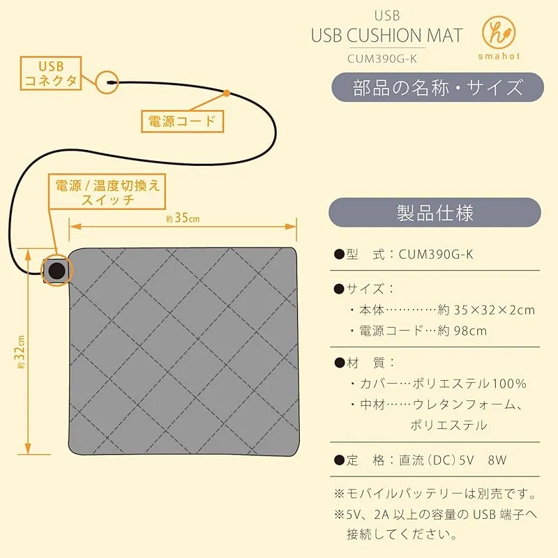 【高い安全性のUSB暖房】当社は電気暖房家電メーカーとして、高品質で安全・安心なものづくりを行っております。そのノウハウを生かした「smahot」シリーズは、ヒーターの断線検知と過熱防止センサーの搭載など、当社独自の設計と厳しい試験により安全性を追求しています。